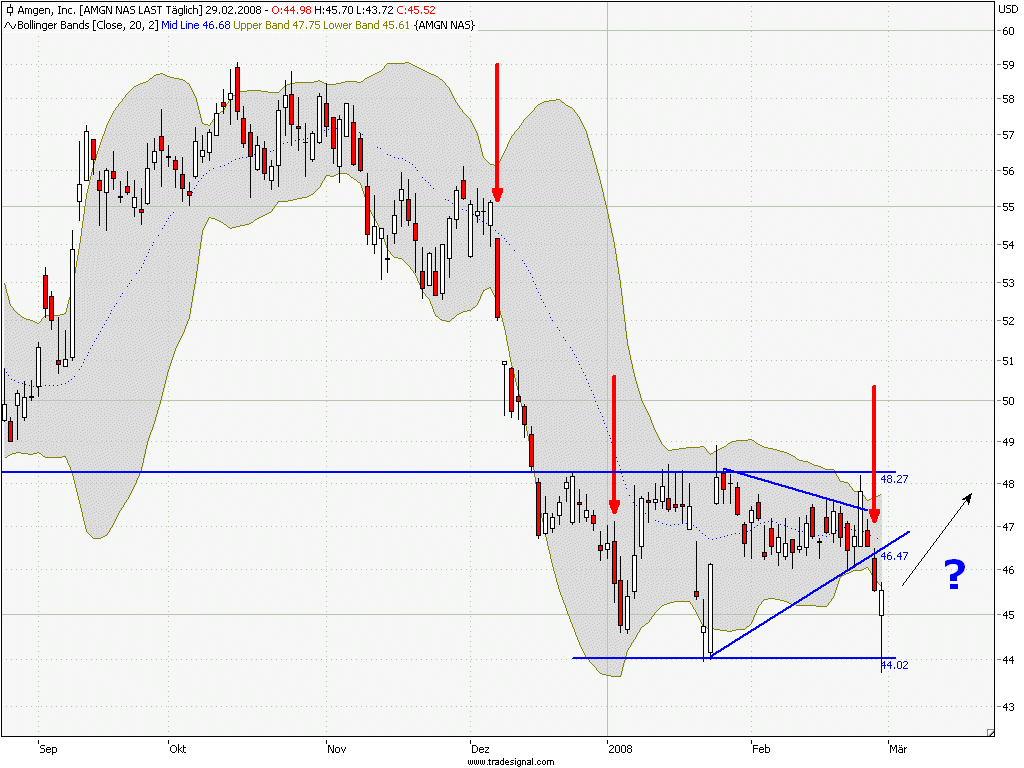 Der am Dienstag angesprochene Widerstand von 48,3$ wurde fast exakt zum Bewegungshoch, seit dem ging es nur noch abwärts. Zwar markiert die bearische Kerze vom Donnerstag einen Trendbruch und das Verlassen der Dreiecksformation gen Süden. Aber da Amgen lange in der breiten Range zwischen 44-48$ festklemmte, verwehrte ich mir einen vorzeitigen Shorttrade. 44$ wurden denn Tags darauf auch sofort angepeilt, am Ende der Woche stand dann aber ein Hammer zu Buche. Könnte also ein schöne Abpraller werden, was eine Verlängerung dieser Seitwärtsphase bedeuten würde.