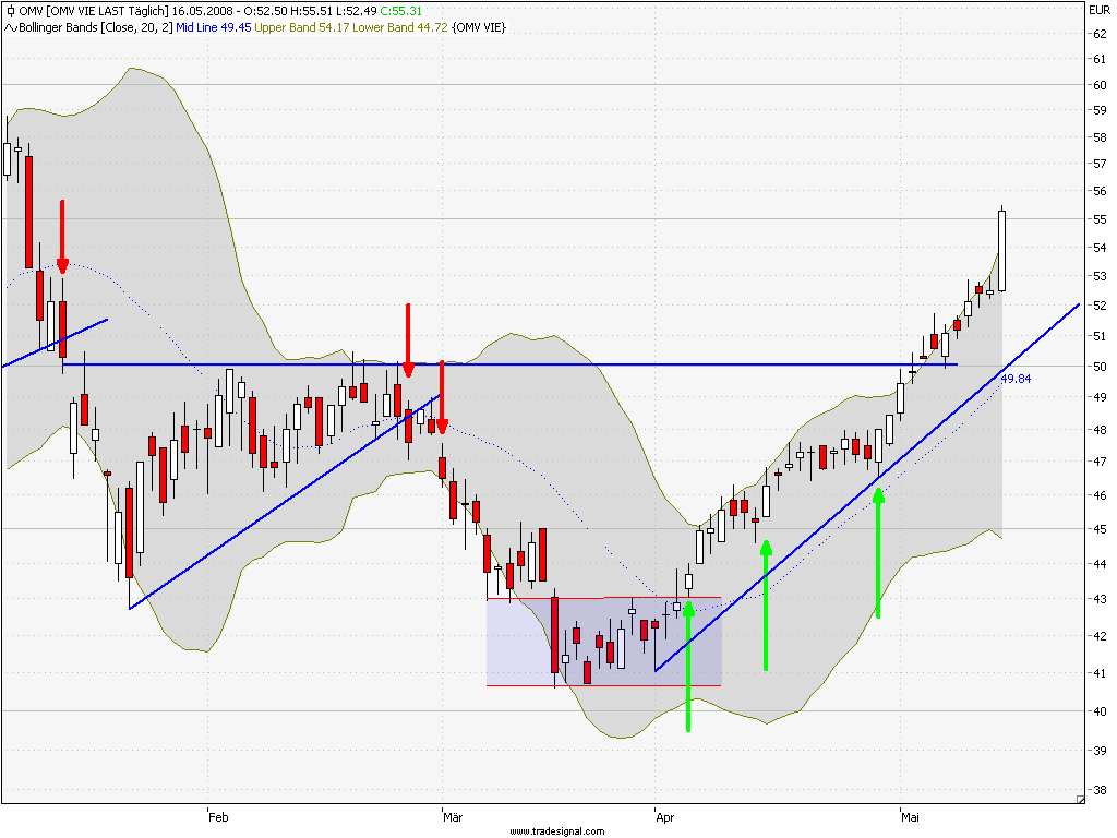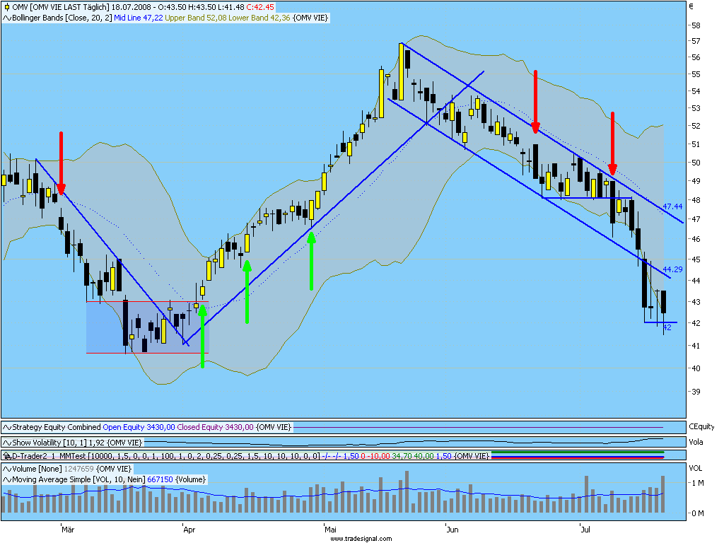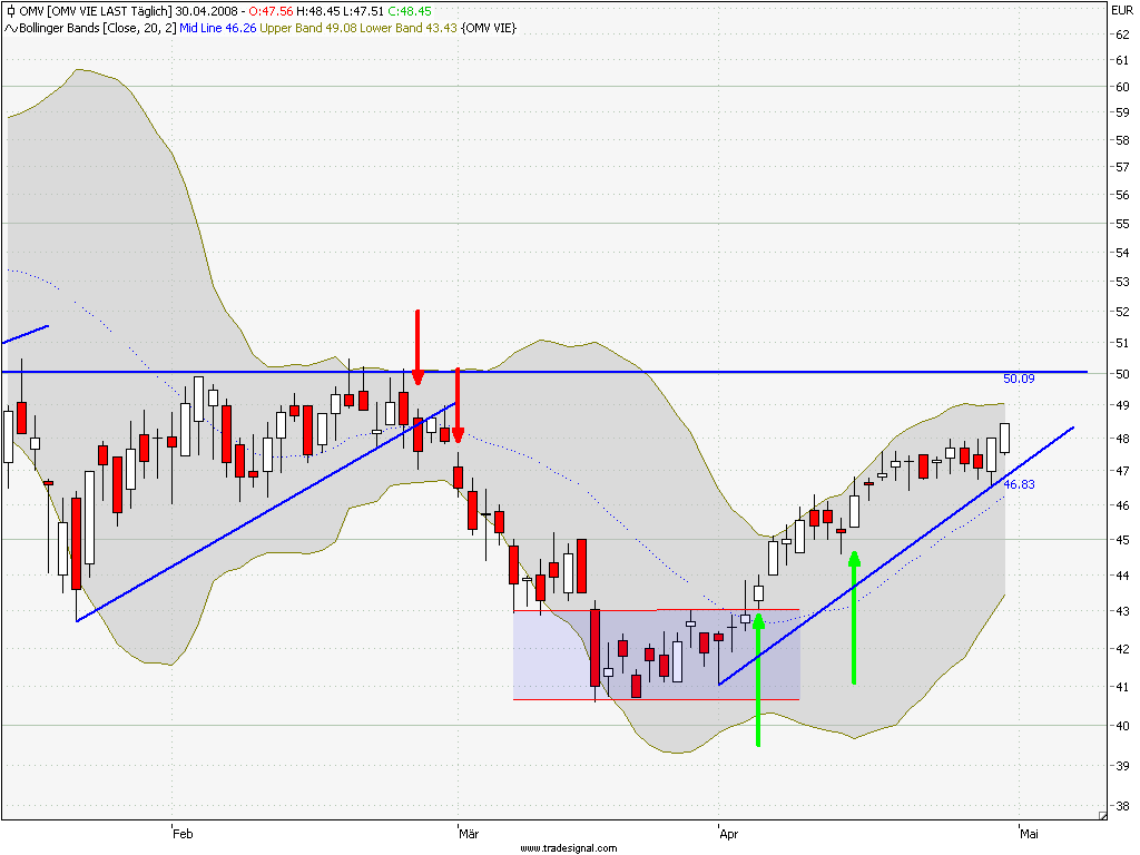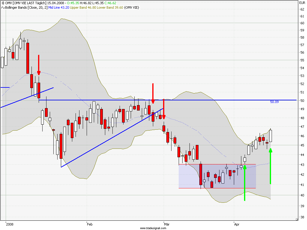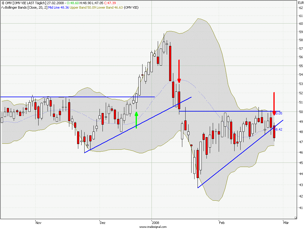Der letzte Abverkauf erfolgte eigentlich bei schwächelndem Volumen. Die letzten vier Handelstage dagegen ist ein starker Anstieg zu verzeichnen, und das bei vier unteren Schatten der Candlesticks, die allesamt um 42€ kämpfen. Spricht also sehr viel für eine Konsolidierung bzw. Gegenreaktion. Ich bevorzuge wenige Tage seitwärts und dann neues Shortsignal, denn Long kommt unter 47€ im Moment nicht in Frage für mich.
