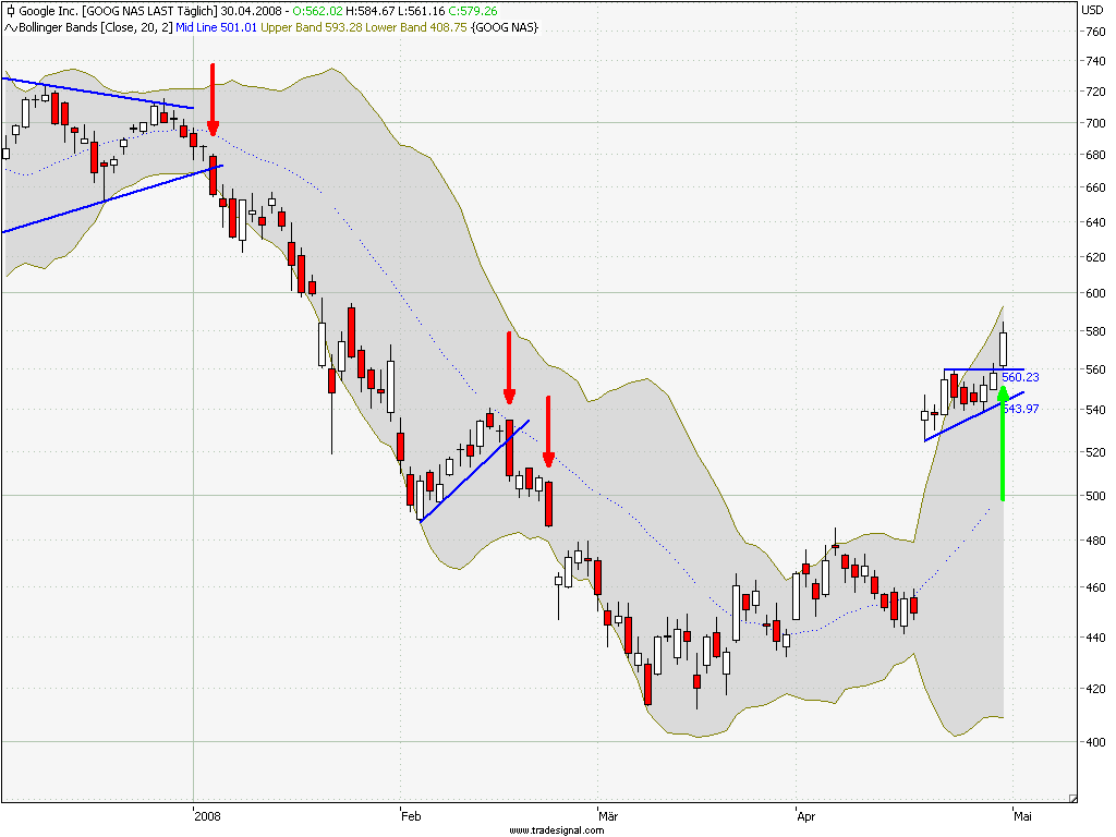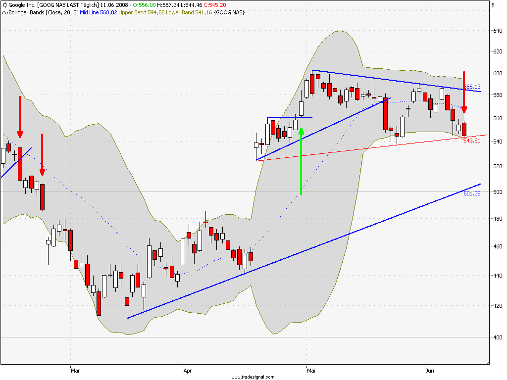 Also dieses Shortsignal vom 11. Juni war für die Katz, da hat der seite Aufwärtstrend über 540$ tatsächlich Stärke gezeigt. Naja, das nächste Mal dann, Google läuft jetzt jedenfalls in einem immer engeren Keil zusammen.