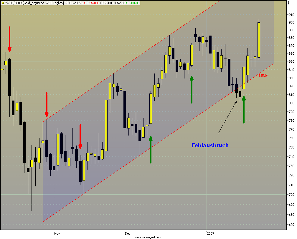 Gold lässt es sich gutgehen im Moment, die 900$-Hürde scheint endlich wieder machbar. War allerdings schon knapp, der Trendkanal am 14.+15.01. futsch. Allerdings ein Fehlausbruch, die ja meist sehr stürmische Gegenbewegungen zur Folge haben. Wie auch wieder in diesem Fall, leider nicht real gehandelt.Der Autor ist in den besprochenen Werten zumeist selbst investiert. Traden auf eigene Gefahr, Signale sind aktuell großteils experimentell zwecks Challenge "In 30 Tagen zur Trading Strategie".