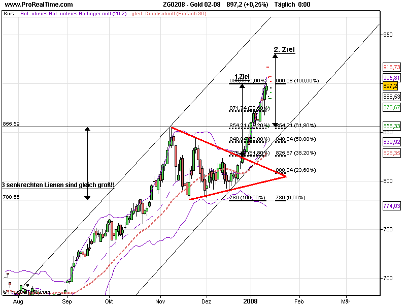 Bin noch nicht wieder drin, denke Gold muss jetzt erst mal die 900$ bestätigen und das nicht nur 1x am besten mit 2 Tagesschlusskursen. Und dann ziel 925$. Sollte Gold natürlich noch mal fallen, so bis 855$ (da ist der obere Widerstand aus der letzten großen Seitwärtsbewegung Nov. -Dez. zwischen 780 und 855) wäre das für mich auch noch mal ein Kauf mit ziel 925$. Mittelfristig sogar bis 1024$(261,8% Fibonacci Retracment vom Ausbruchslevel 780$).