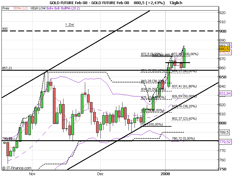 Gold gebe ich noch Luft bis 884. Bei Durchbruch mit Bestätigung der 884 wäre Anlauf auf 925 möglich. Gewinne würde ich jetzt mitnehmen. Die 900 könnten wir sehen, genauso wie beim Öl, die 100 Dollar eine magische Zahl im Markt war, die wollte man sehen. Nach meinen Gesichtspunkten würde ich ein Teil der Gewinne bei 884 mitnehmen und einen Teil weiterlaufen lassen. Die ersten Bären sind aber schon gesichtet worden. Sei vorsichtig!