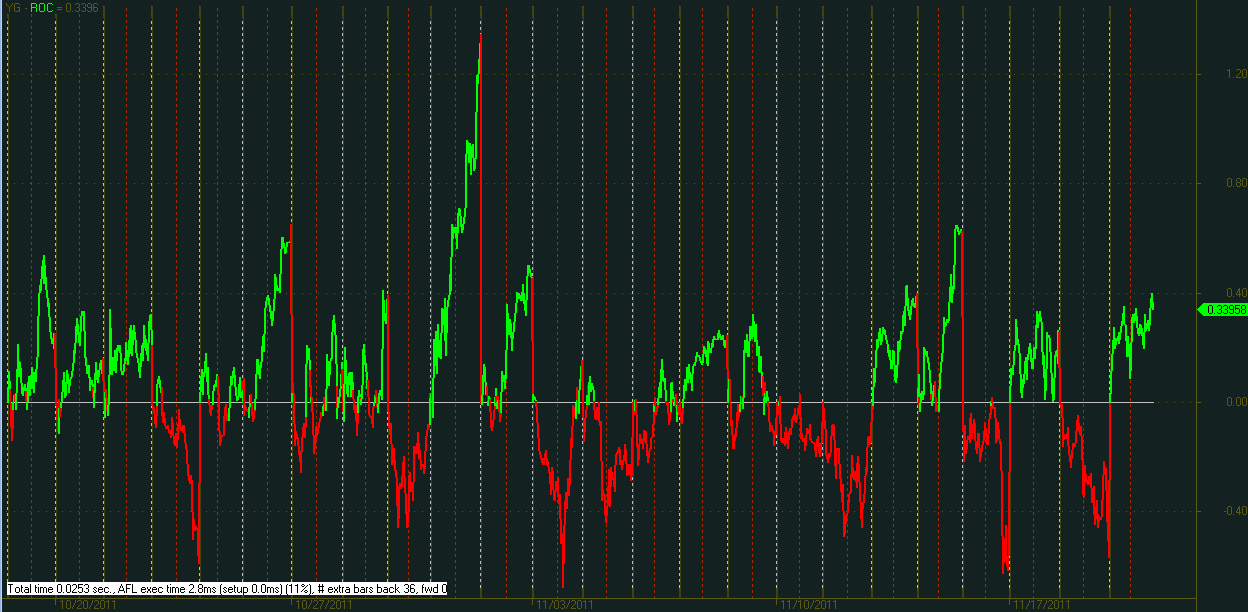 Im M1 Chart ein Teilausschnitt davon über die letzten 4/5 Wochen (ROC = Rate of Change in %). Von weißer Linie bis zu weißer Linie ist immer 15:30 bis 16:30, somit immer jeweils "ein Tag". Rote Linie ist somit immer 16:00.