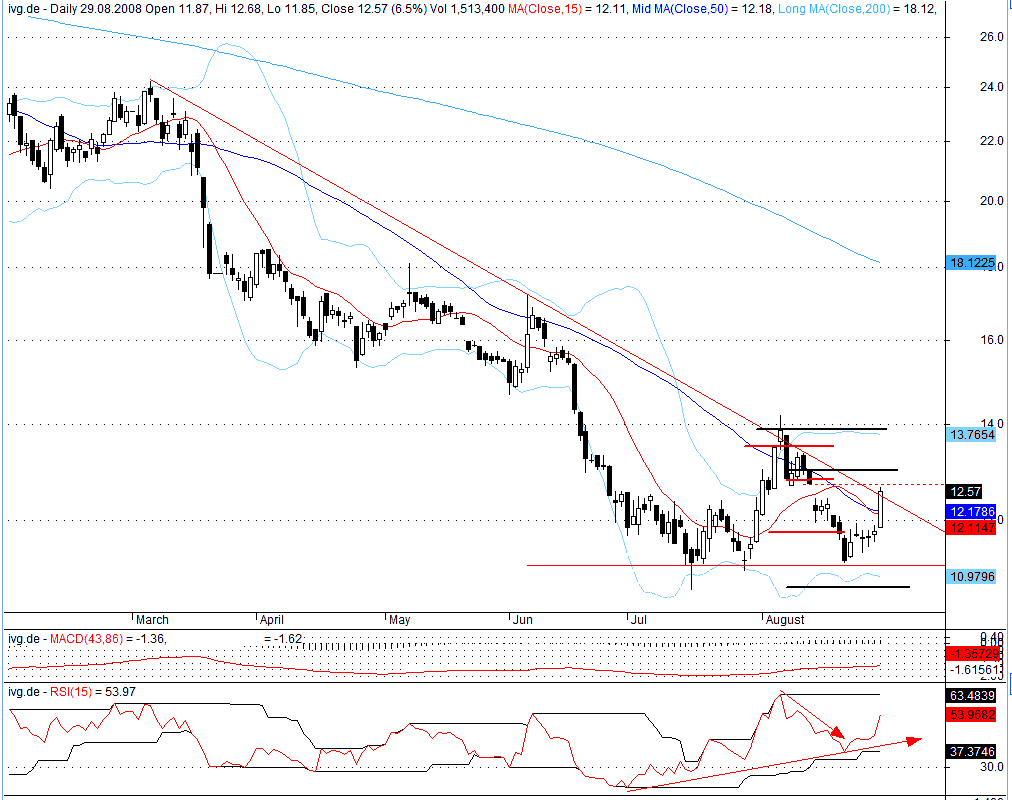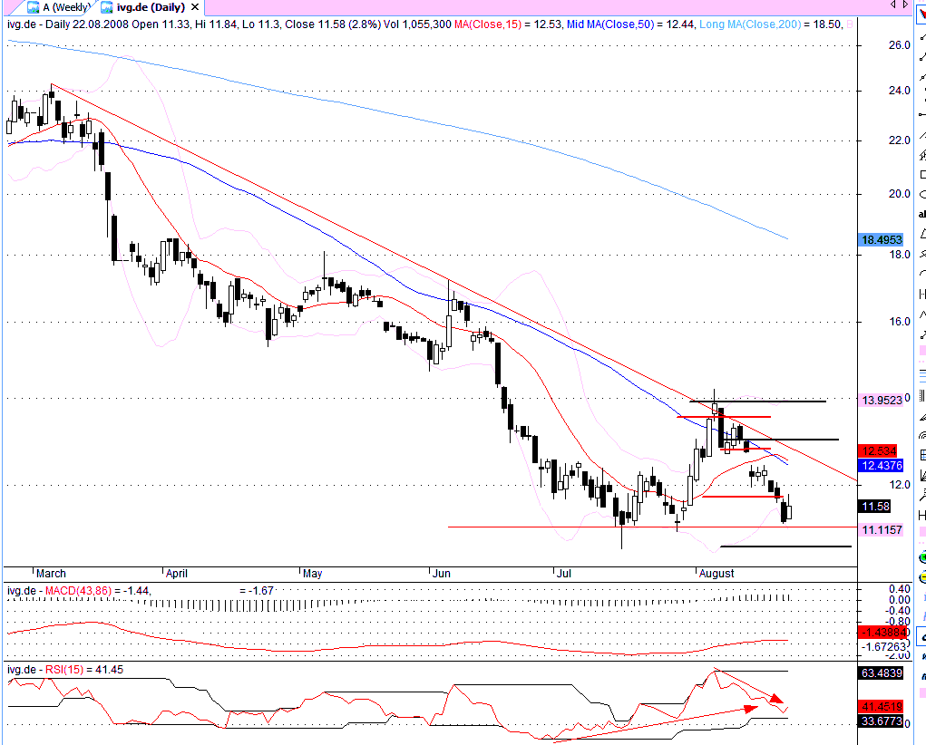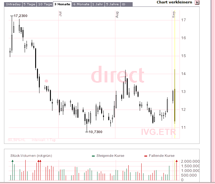 Muss Dir nicht Leid tun. Im Gegenteil, dein Tradingstil ist mir durchaus sympathisch. Meine Motivation, bei IVG long zu gehen, ist ja auch nicht charttechnisch begründet. Ich halte den Wert für fundamental so interessant, dass ich mich sogar zu der Aussage hinreißen lasse, dass der Markt bei IVG gerade Geld verschenkt - der Wert ist substanziell einfach viel zu billig, was nicht heißt, dass er nicht noch billiger werden kann. Meine Schmerzgrenze bei IVG ist, wie schon geschrieben, noch lange nicht ausgereizt. Der SL steht nach wie vor. Bauchschmerzen bekomme ich erst, wenn sich die Gründe für den Trade signifikant verändern, will sagen, sich die Fundamentaldaten ändern. Dann erst bin ich bereit, auch vor Erreichen den SL zu verkaufen. -