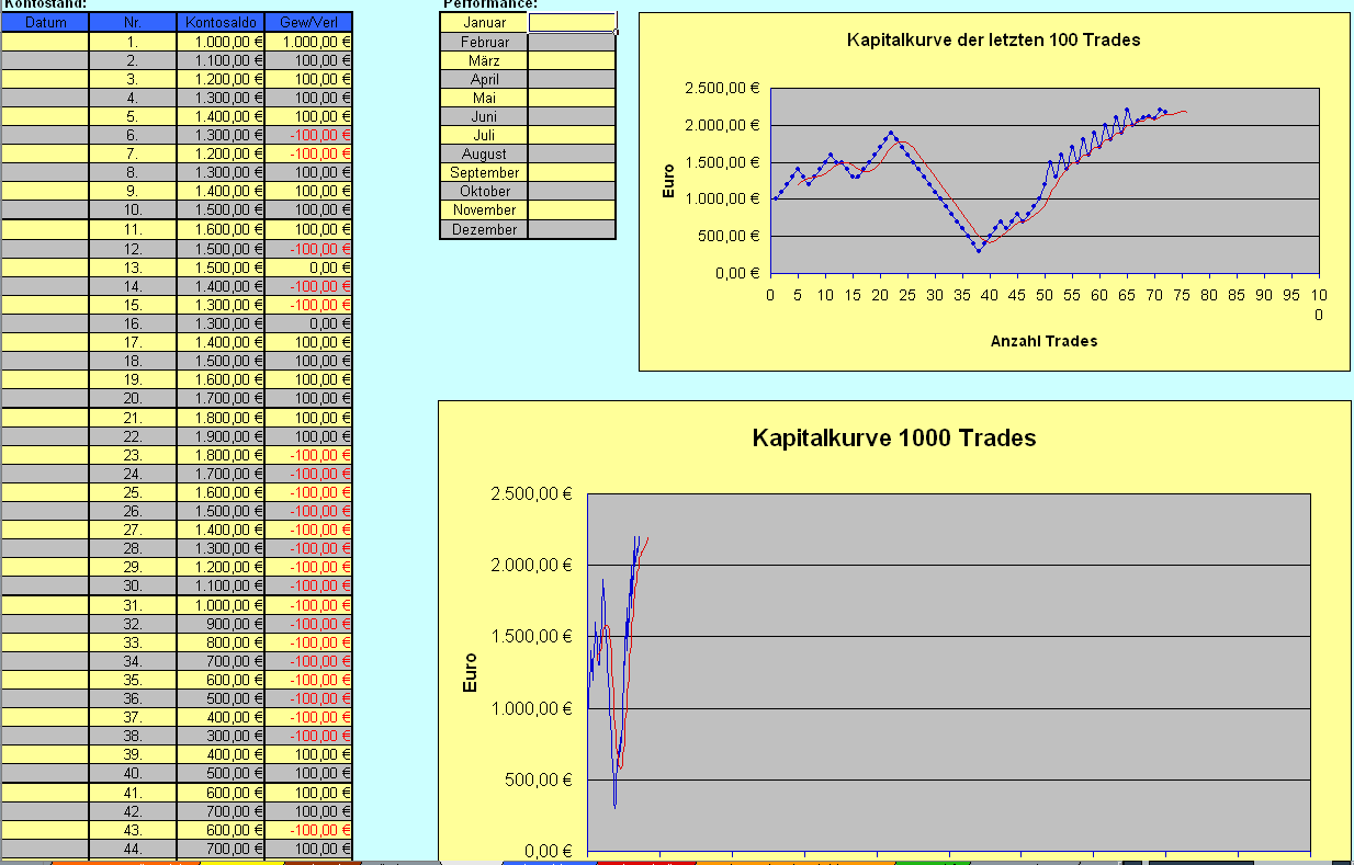Du weißt jedenfalls, was Du vorhast. Na dann, schnapp dir ein RealMoneyKonto und trade deine Strategien. Würde aber vorschlagen nicht mehr als 0,5 Prozent pro Trade zu riskieren. Für den Anfang. Da kannst du Dir auch den einen oder anderen Schnitzer erlauben. Auch mal sehen wie frustrierend es ist, wenn mal nix klappt oder wenn man einen Fehler zum zichsten mal gemacht hat. RealMoney provoziert erst richtig solches Verhalten. Dann gilt es, seine Schlüsse daraus zu ziehen und zu lernen.Mehr gibt es jetzt von mir nicht zu sagen. Bin selber noch jemand mit einen Haufen schlechter Angewohnheiten...
