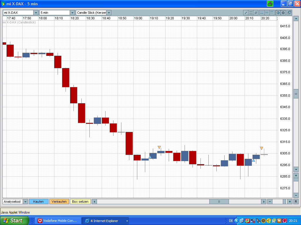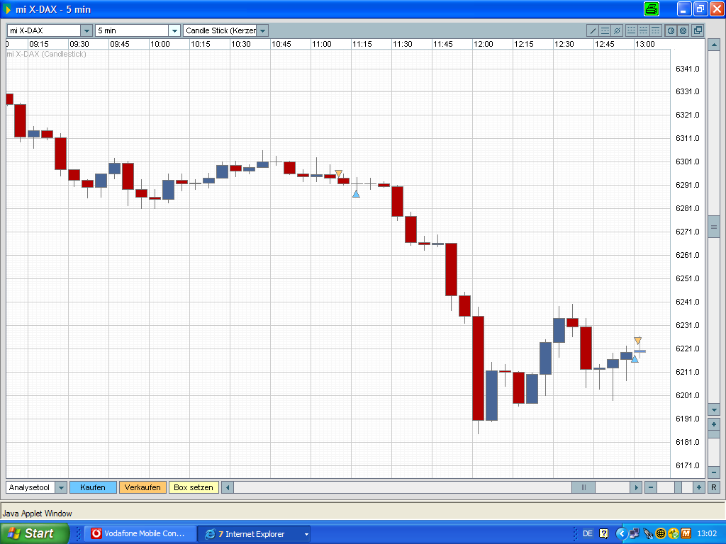 Heute 2 Trades.Zum 1.vielleicht 2 Bemerkungen.Er lief ja für mich relativ lange.Habe immer Trailingstopp nachgezogen+1bis 2Pkt.Rauschen.Sonst wäre ich schon draußen gewesen.Die Kerze vor meinem Ausstieg war ja eigentlich ein Musterhammer,hätte also mit einem noch höheren Anstieg rechnen müssen.Ärgert mich ein wenig.
