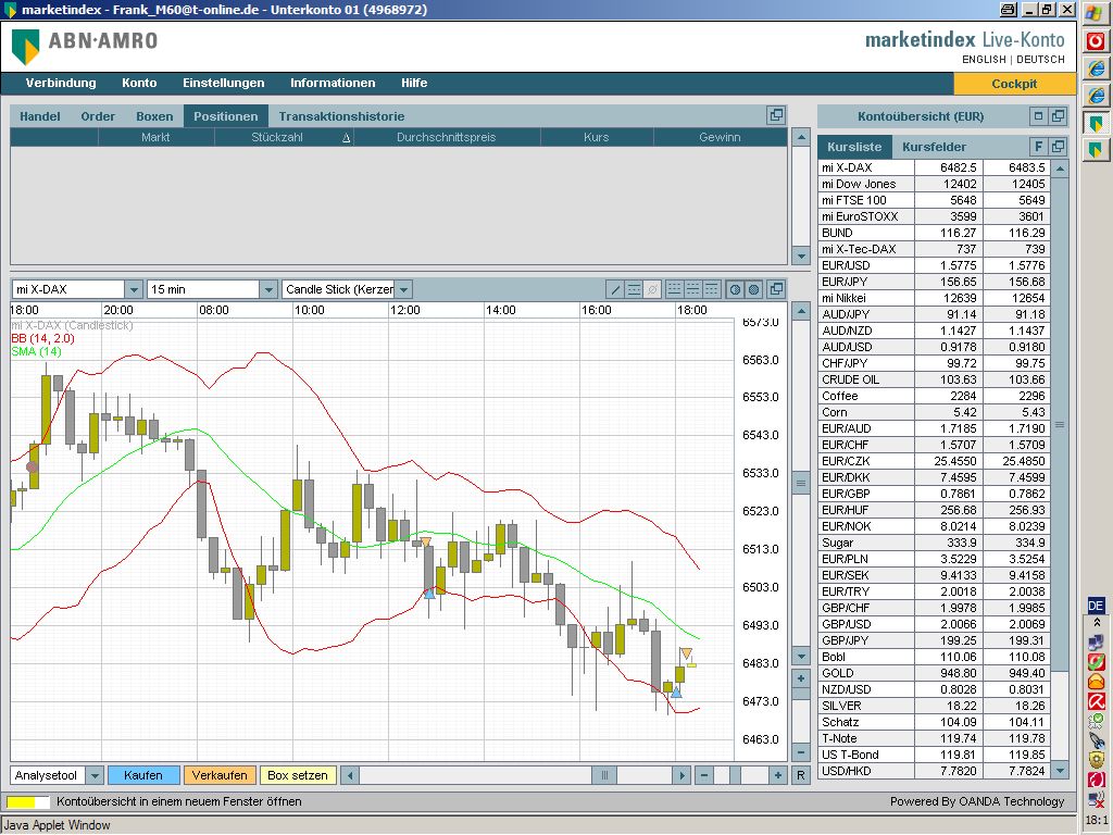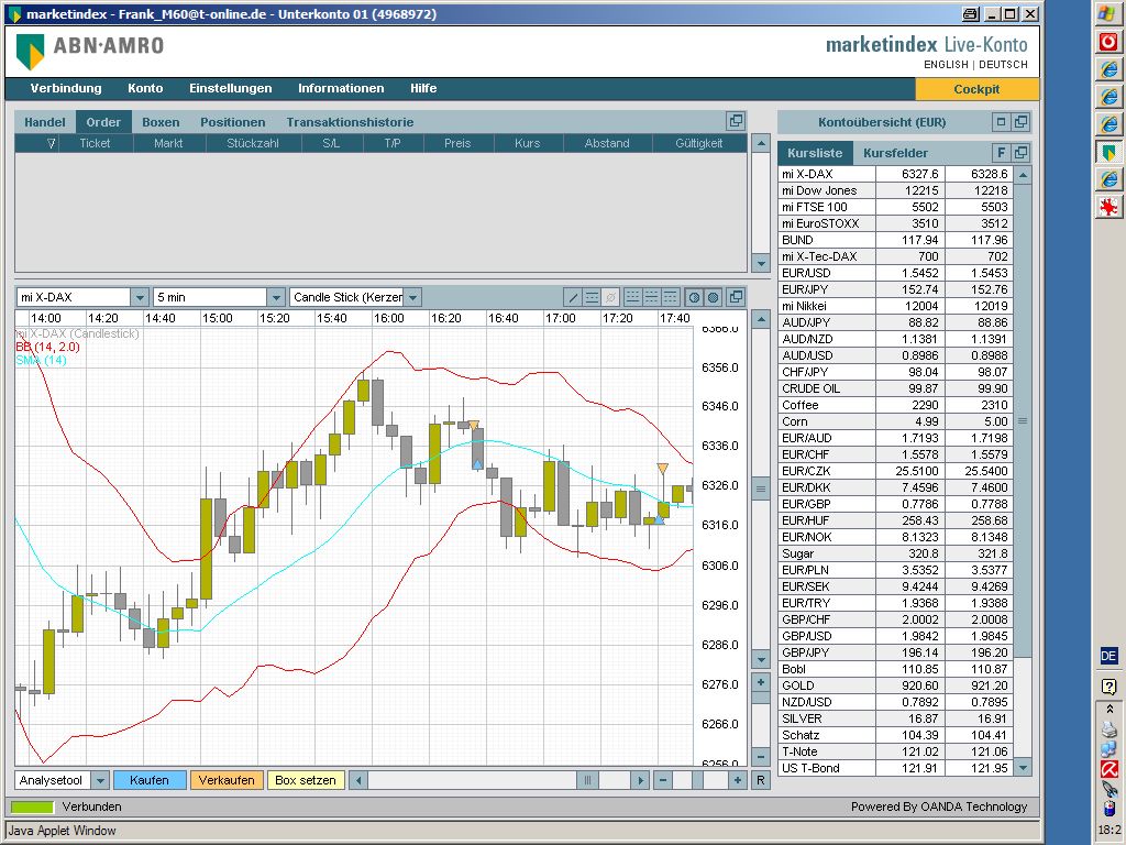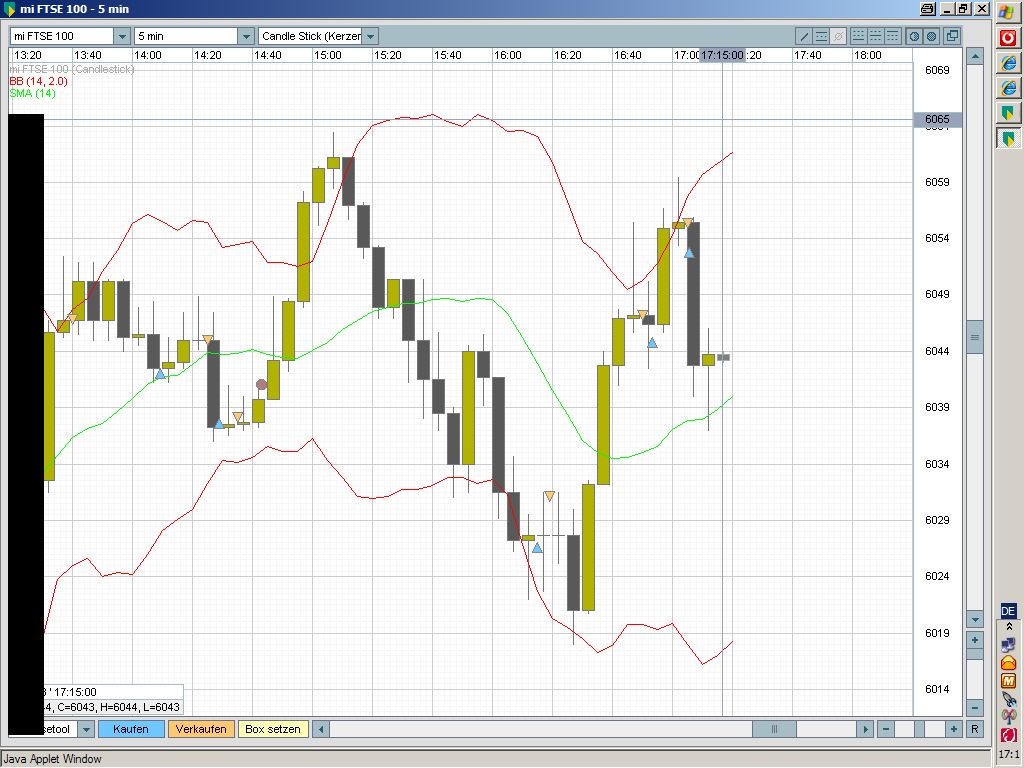 Hallo,ich habe mein Technikproblem noch nicht ganz lösen können,trotzdem will ich wieder mit dem regelmäßigen Trading beginnen.Habe meine Setups mal im FTSE -5M-ausprobiert.Bleibe auch eine Weile in diesem Markt.Scheint ebenfalls zu funktionieren.Heute 6 Trades,davon einer im Minus.15 Pkte erreicht.Stelle fest,das der Doji auch für 3-4 Punkte gut ist.Werde weiter beobachten u.mal handeln.