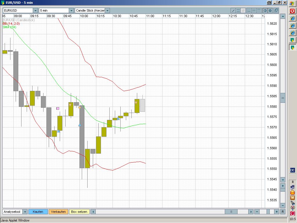Hallo,da bin ich wieder.Konnte die letzten beiden Tage nichts tun.Mich hats erwischt(Grippe) u.da ich vor kurzem umgezogen bin,brauchte ich eine neue Internetverbindung. Heute habe ich 2Trades gemacht,diesmal im 5er.Damit keiner denkt,ich mogle u.nur die Trades reinstelle die klappen,habe ich immer den ganzen Tag dokumentiert.Also heute 16Punkte u.Schluß.