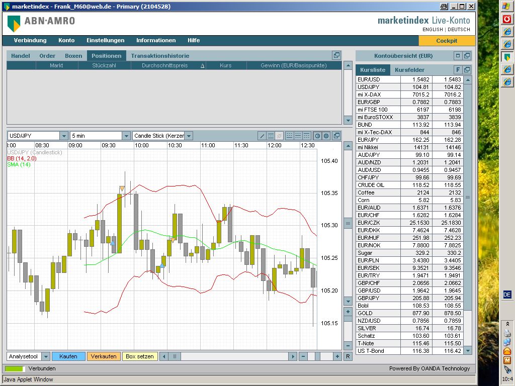 Hallo,nachdem ich in den letzten Tagen die Devisen beobachtet habe,werde ich in den nächsten Tagen die Pairs EUR/USD,EUR/GBP und USD/JPY vorrangig traden.(1 Pip Spread bei ABN ist ok.) Meine "Hammer"Setups scheinen hier wohl auch zu funktionieren.Ich versuche mein Tagesziel auf 20 Pips zu erhöhen.Übrigens habe ich meine CFD Anzahl wieder um 1 erhöht.Langsam bemerke ich,wie sich der Puls nach dem Einstieg ein wenig erhöht hat zum Vergleich während der ersten Monate.Da ich meine SL aber konsequent einhalte u.nachziehe,war bis jetzt alles ok.Ich glaube fest daran ,das es gut weiter geht.20 Pips u.dann Schluß.Jedenfalls ärgere ich mich nicht mehr über einen möglichen größeren Gewinn.Außerdem kann man mit dieser Methode auch mit kleinem Kapital an der Börse langfristig Geld verdienen.Oft habe ich von Freunden gehört,das sich das wohl erst 10000 Euro rechnet.Ein Rechenbsp:DAX Stand v.8000 Punkten,bei einem Hebel von 4 kannst Du ihn mit 200 Euro kapital handeln.Dafür bekommt man 1CFD.15 PKT. sind 15 Euro am Tag,20 Tradingtage im Monat sind 300 Euro.Für 500 Euro bekomme ich nun schon 2CFD.600 Euro im Monat,usw. Einzige Vorraussetzung ist,daß ich zunächst mein Geld stehenlassen muß u.natürlich die 15 Pkt.Tagesgewinn.Und das ist,so glaube ich fest,möglich.Sicherlich gibt es bei den Profis ein paar Einwände,denn wenn es wirklich so einfach ist,warum macht es dann nicht jeder.Mich würden dazu Eure Meinungen interessieren.