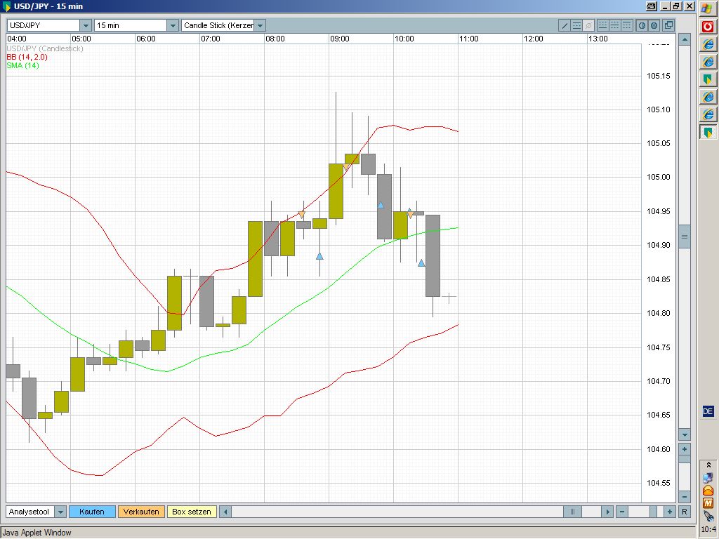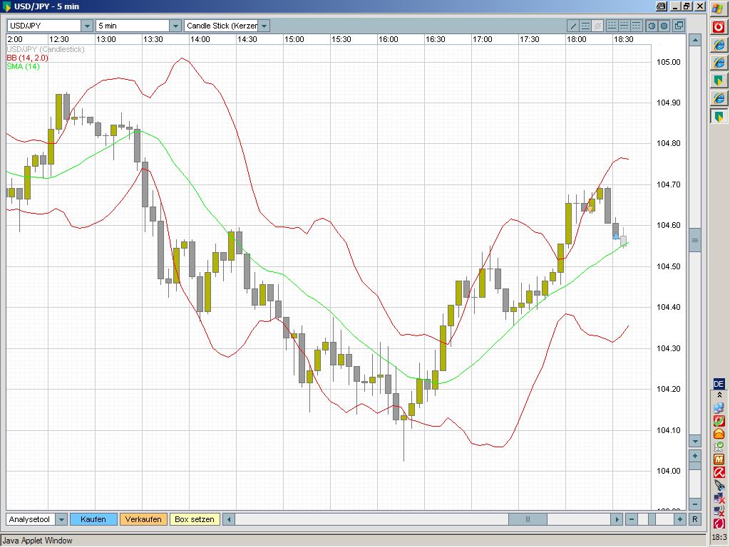 Ihr habt recht,ich hatte schon erwähnt ,das ich nicht nach den Candlesticksformationen nach Nison handle.Die Umkehrkerzen trffen es wohl schon am nächsten,wobei sie nicht unbedingt nur an den BBs und Gleitenden Durchschnitt enstehen müssen.Auch die schatten müssen gar nicht so lang sein,im Gegenteil.DEnn um so länger sie sind,je weiter muß ich zunächst meinen Katastrophenstopp setzen.Es reicht mir eigentlich schon,wenn der Docht langer als der Körper ist. Ich habe auch schon weiter modifiziert.So handle ich in der Abwärtsbewegung keine roten "Umkehrkerzen" mehr.ZU oft hat sich die Richtung besätigt.Bin weiter am Beobachten.