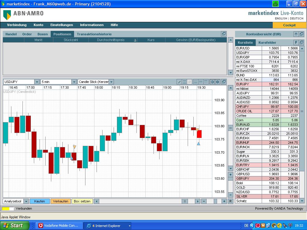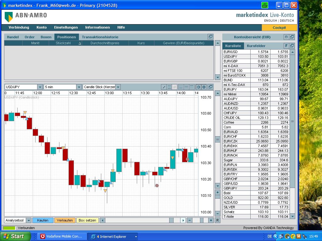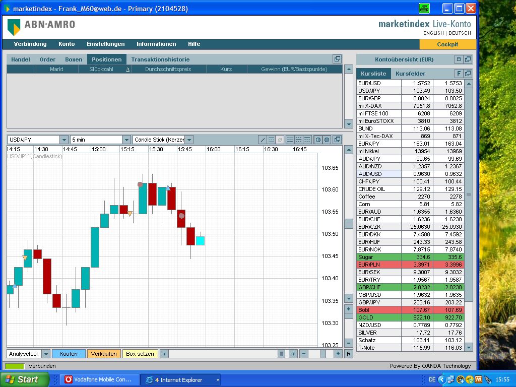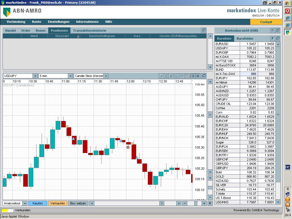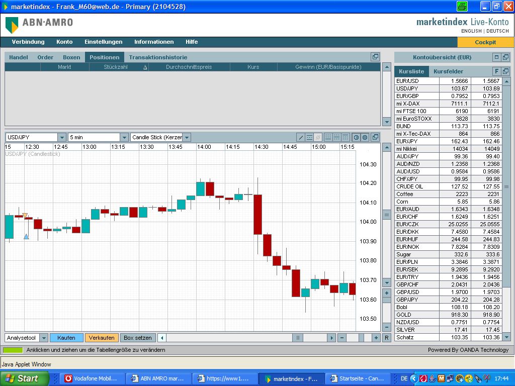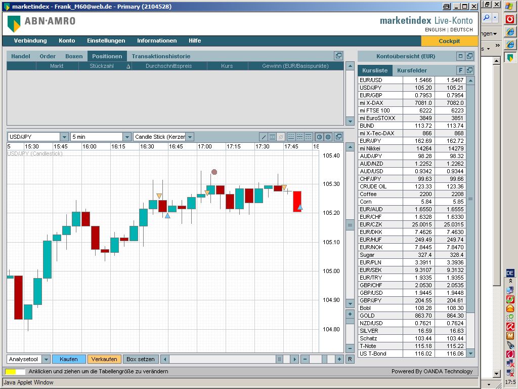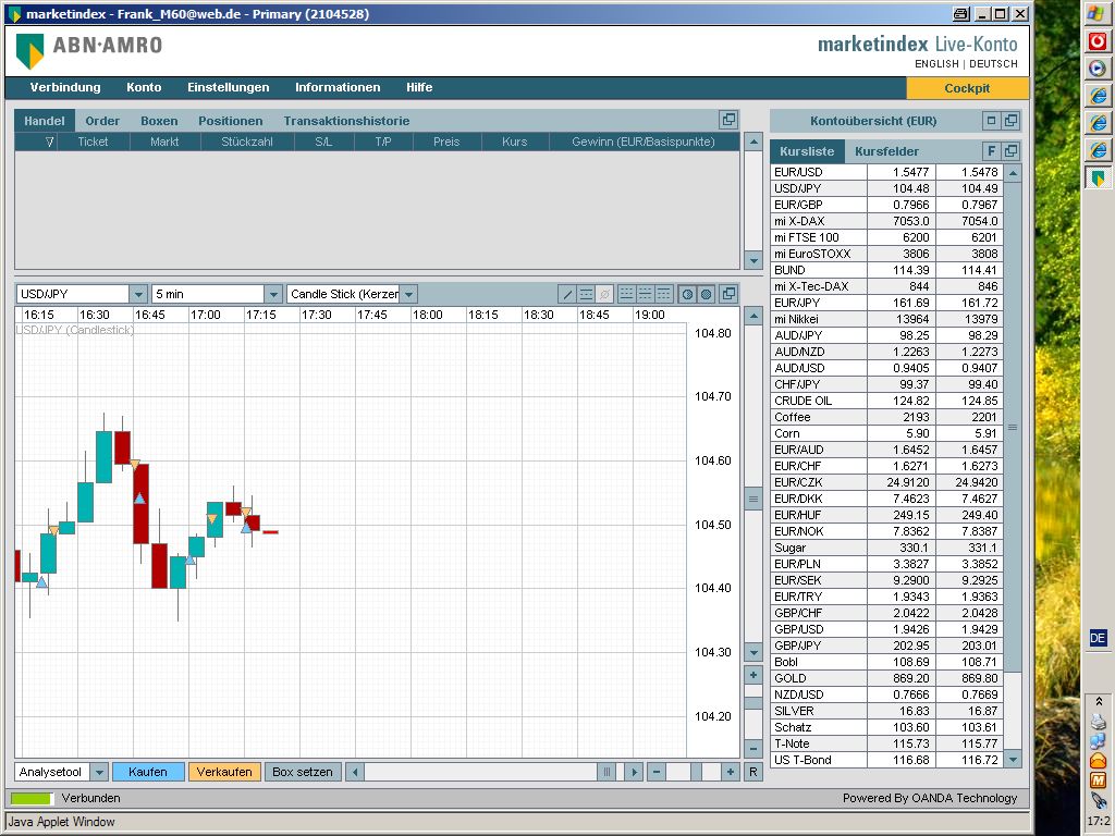Trade4:Hammer,wo dieser Stopp herkommt,weiß ich selber nicht.Hatte ihm auch ein Pünktchen Luft gegeben u. hätte nicht ausgeöst werden.Aber sei es drum,ich bin selber Schuld.Hab z.Z.wieder nach vielen schönen Tagen Probleme mit meiner Internetverbindung(im Techniktread beschrieben)Denn just während dieses Trades,brach die Verbindung ab.Als ich wieder einloggte,sah ich die Bescherung.Trotzdem bin ich mir sicher,daß die Stopplinie höher lag.Hat vielleicht der Abbruch den Stopp nach unten gezogen ;) Aber wie gesagt,hätte ich diesen Trade gar nicht mehr machen dürfen.Zu guter letzt noch ein Hammer