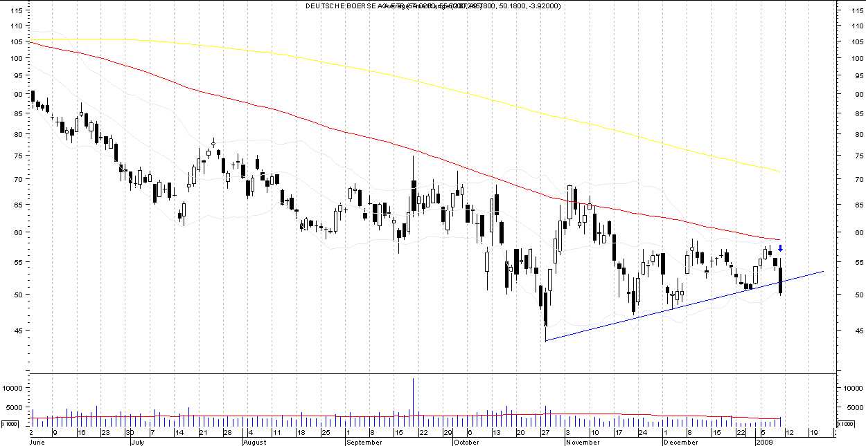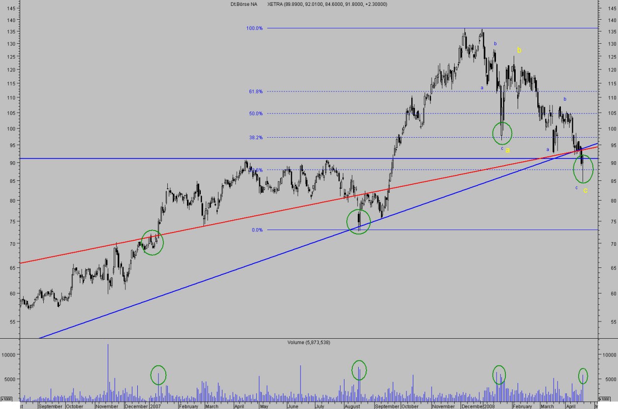 Das sieht schon fast wieder zu schön aus - sogar die Wellenzähler werden in dem Muster bedient. Einzig die gebrochene diagonale Trendlinie "stört" ein wenig, wird aber wieder lehrbuchmäßig signifikant, wenn sich der Bruch als Fehlbruch herausstellt. Der auf Schlußkurs gehaltene horizontale Widerstand und das starke Volumen überzeugen mich aber. In der Aktie der Deutschen Börse AG sollten eher Käufer als Verkäufer auf den Plan treten: