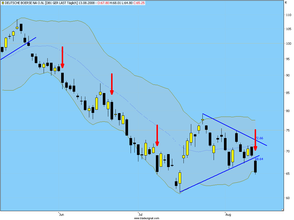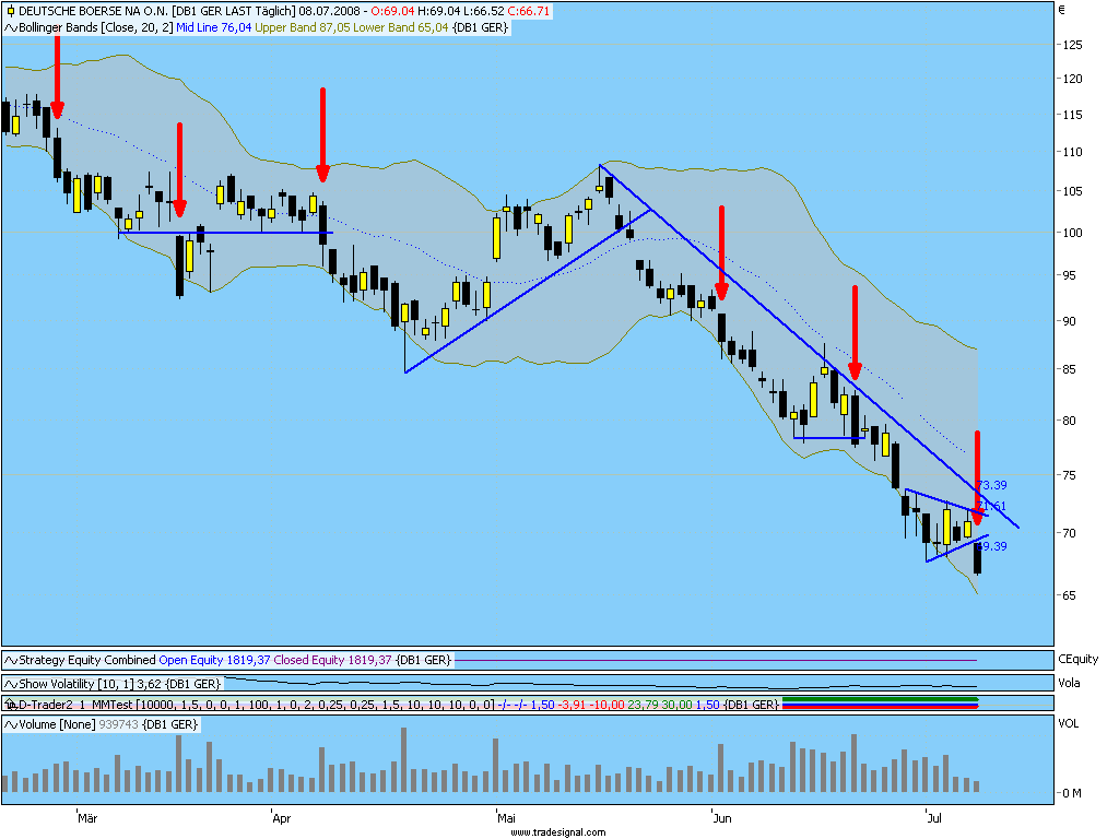 Deutsche Börse war heuer schon für einige schöne Shortsignale zu haben, so auch jüngst am 20.Juni. Heute könnte der Abschluss eines Wimpels erfolgen, ein weiteres klar bearisches Fortsetzungssignal. Der Kurs scheint kein Halten zu kennen, sinnvolle Unterstützungen sind nicht mehr auszumachen. Ein folgender Longtrade kommt unter 75€ im Moment nicht in Frage.Der Autor ist in den besprochenen Werten zumeist selbst investiert. Traden auf eigene Gefahr, Signale sind aktuell großteils experimentell zwecks Challenge "In 30 Tagen zur Trading Strategie".