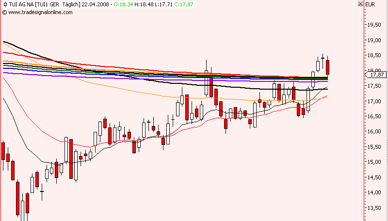Hab ich mir heute durchgetestet, und fällt für meinen Tradingstil durch. Liegt am hektischen Jahr 2007, da konntest Trendfolge ja vergessen. Wenn nicht, hätte ich seit dem 17.04. ein Longsignal zu 17,95 mit Ziel 19,8. Spätestens ab 16,5 gehts wohl wieder zurück bis 13€