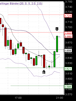 Beide Voraussetzungen trafen heute zu. Mit dem schon öfters erwähnten Beispieltrade von 3 Stück und Gewinnmitnahmen mit 2 Stück verbleibt jetzt noch die Teilposition mit 1 Stück. Gewinn bis jetzt 220 Punkte.