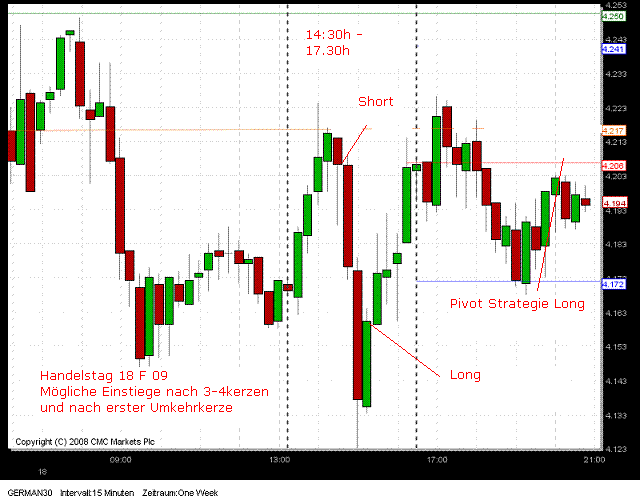 Der Handel im " Niemandsland " zwischen 14:30h und 17:30h kann wie folgt gehandhabt werden . Siehe eingefügter Chart vom 18 Februar . Einstieg Short / Long nach 3-4 Folgekerzen einer Couleur und Einstieg nach der ersten Umkehrkerze. Gewinnmitnahme nach 1-2 Kerzen .Stopp loss immer 5 Punkte unter / über der letzten Kerze.