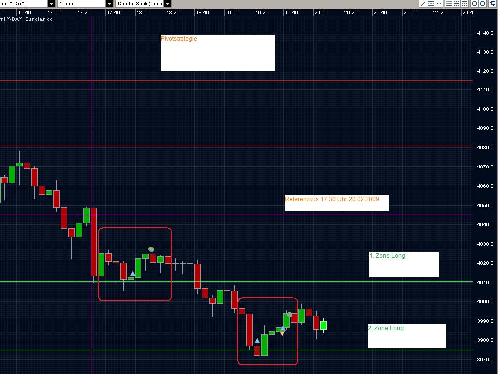 Abweichungen von diesem Bewegungsmuster , optisch zu erkenen an Ab - Zukäufen die zügig zum Einstieg an der Zweiten Zone führen , sind immer dann festzustellen , wenn der XETRA DAX ein Trendtag , Close am Tagestief / - hoch, hingelegt hat .Zwei Faktoren spielen die entscheidente Rolle: 1. Auktion XETRA DAX um 17:35h. Es kommt