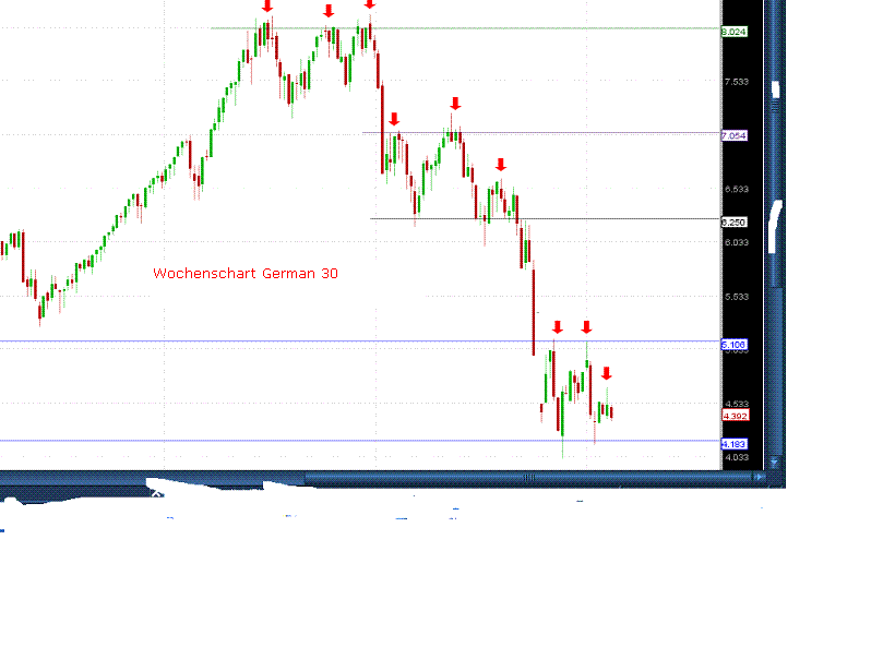 Aus meiner Sicht gehören Wahrscheinlichkeiten der Kursdynamik zum Trend ,die sich ja in jedem Zeitfenster ständig manifestieren. Eingefügt Tageschart German 30 mit einer Berichtszeit seit Oktober 2008. Ein perfekter Seitwärtstrend ( ist auch ein Trend ) mit einer Handelsspanne von durchschnittlich 1000 Punkten. Einstiege Short über und Long unter dem Mittelwert 4600 hätten sich gelohnt. Ein ähnliches Chartbild ist immer wieder zu beobachten . Siehe Mai - Dez. 2007 und Januar - Juni 2008. Trends innerhalb eines Trends sind insbesondere für Swing Trader interessant.