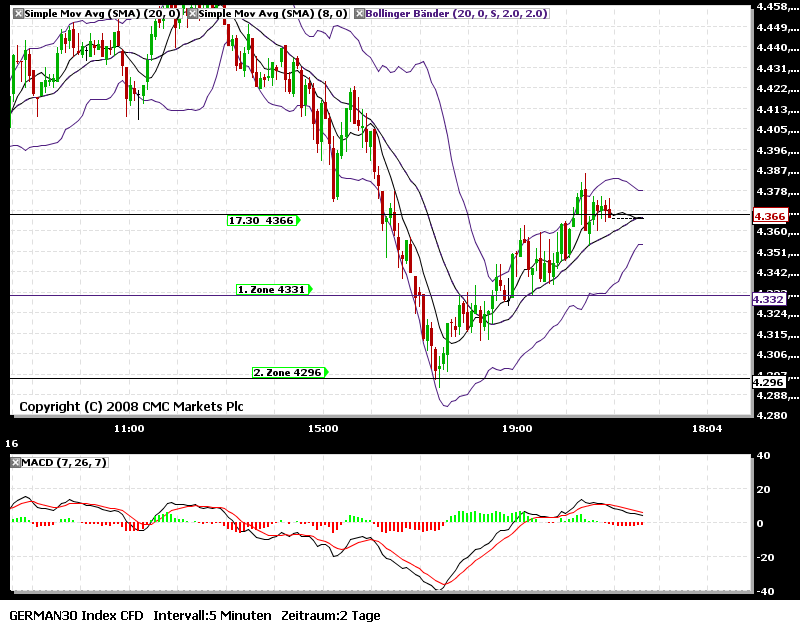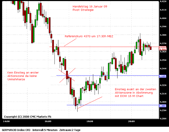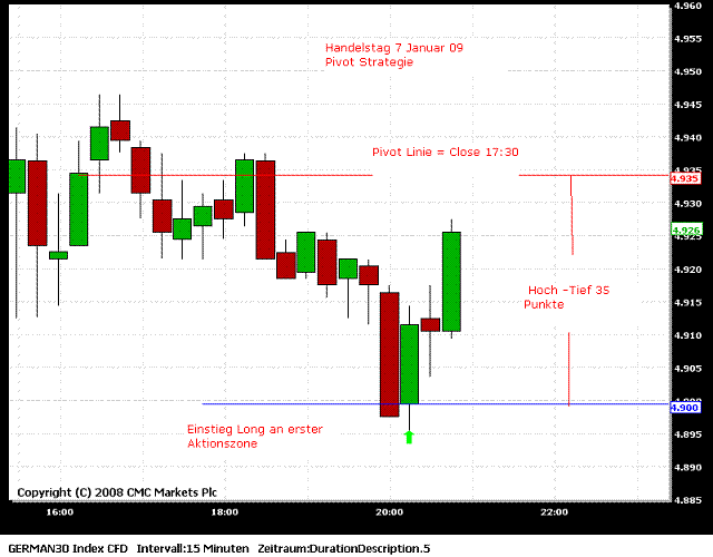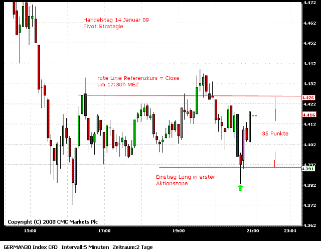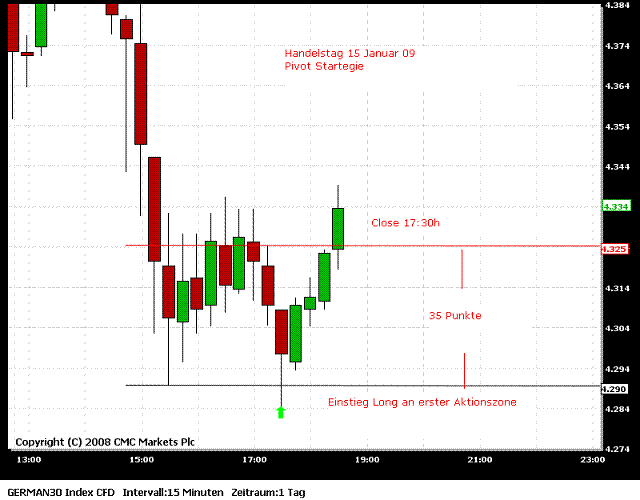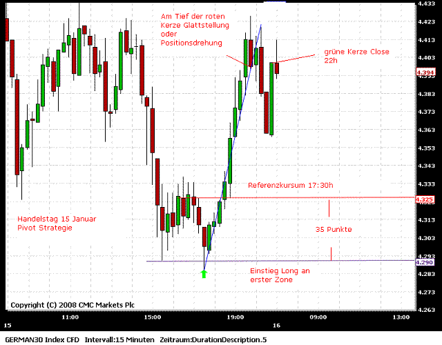Ich werde (unter anderem) im Moment die Pivot-Strategie von Bollinger mittraden. Das setzt natürlich voraus, das man die Strategie verstanden hat. Empfehlen kann ich dir nur die Ausführungen der Strategie von Bollinger genau zu lesen und anhand der mitlererweile vielen eingestellten Beispielcharts zu überprüfen. Vielleicht ist es anfangs auch hilfreich nur den Referenzkurs (um 17.30 Uhr) und die einzelnen Zonen in den Chart zu zeichnen und dann einfach nur den Kurs zu beobachten.