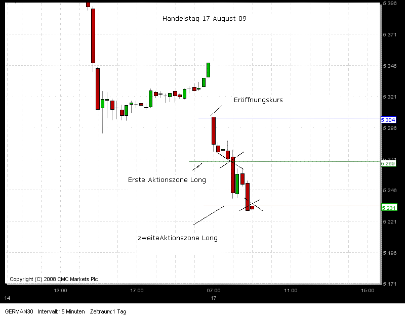 eingezeichnet die ich hiermit kommentieren möchte. Ist an der ersten Aktionszone regelwidrig ein Einstieg erfolgt , Dow Futures notierten satt über 40 +, dann wird die Position entweder mit Gewinn oder spätestens nach der 3 15 Minuten Kerzen Regel glatt gestellt.
