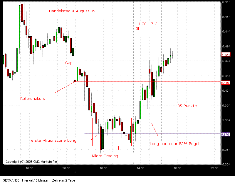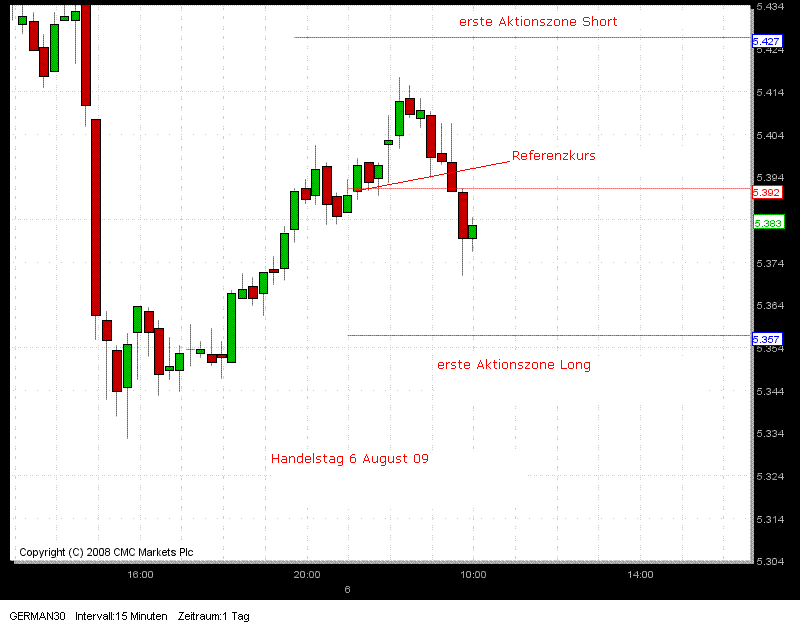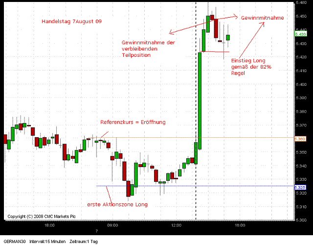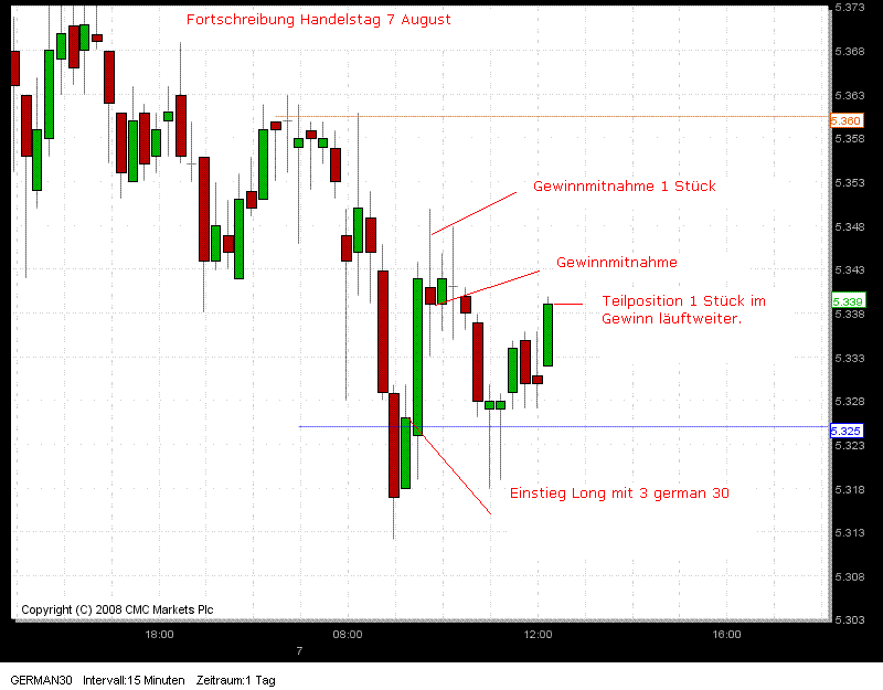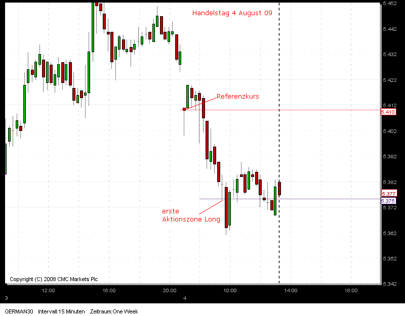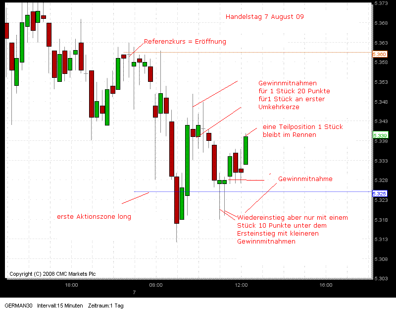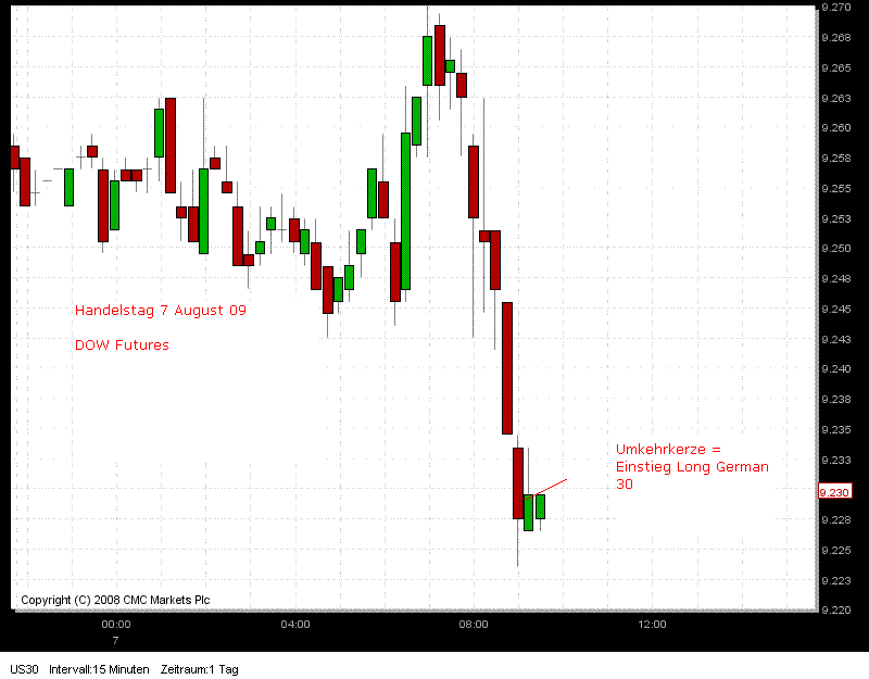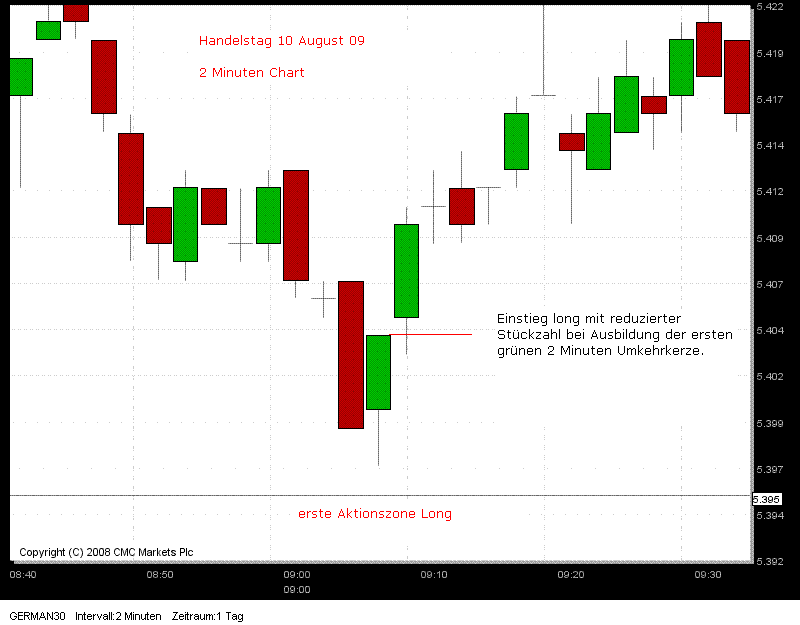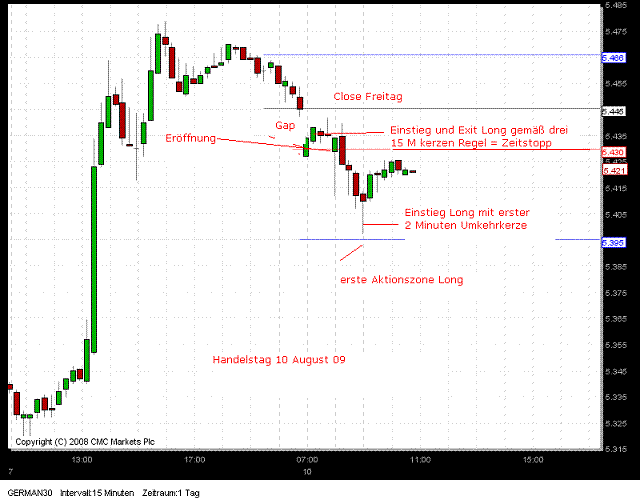 Nach dem neuen ,wenn auch kleinem Jahreshoch am Freitag , ist bis zur Eröffnung der US Börse mit sehr geringer Vola zu rechnen . Aber auch dort stehen heute keine Veröffentlichungen von Wirtschaftsnachrichten an. Der FDAX eröffnete mit einer - Gap von 11 Punkten , jedoch 28 Punkte unter dem XETRA DAX Close. Wie schon letzte Woche erfolgte heute der Ersteinstieg unter dem Eröffnungskurs. Zunächst erfolgte , wie mit Beitrag 561 ausführlich beschrieben , ein Einstieg Long mit reduzierter Stückzahl in Richtung Gap Schließung.Dieser Versuch wurde gemäß der 3 Kerzen Regel mit einem Zeitstopp mit breakeven beendet. Die 3 Kerzen Regel besagt , daß , wenn ein Einstieg außerhalb der Aktionszone mit dem Ziel der Gapschließung erfolgt und das Ziel nach drei 15 Minuten Kerzen nicht erreicht wird ein Zeitstopp die Position auch mit eventuellem Verlust glatt stellt. Im weiteren Verlauf sackte der Kurs bis fast an die erste Einstiegszone Long ab . Zu diesem Zeitpunkt notierte der XETRA Dax mit 60 Punkten im Minus, die DOW Futures jedoch nur mit 15 Punkten. Eine reduzierte Long Position konnte riskiert werden auch wenn man zuweilen dem Kurs etwas hinterher läuft. Einstieg erfolgt dann in einem kleineren Zeitfenster und zwar mit erster 2 Minuten Umkehrkerze. Siehe Chart. Analog zum Micro Trading werden kleinere Gewinnmitnahmen angestrebt. Neulinge der Strategie und Risiko averse Trader verzichten auf diesen Einstieg.
