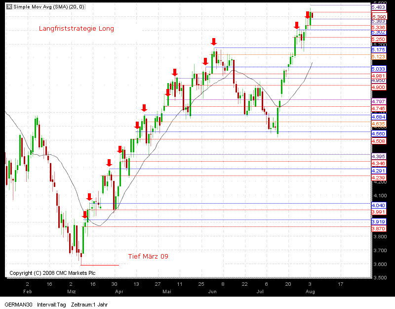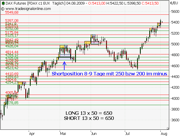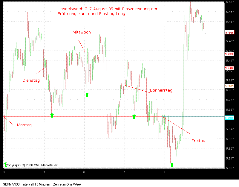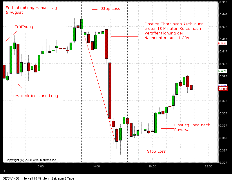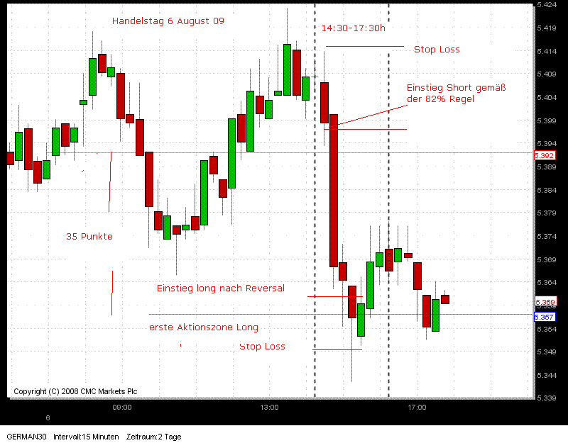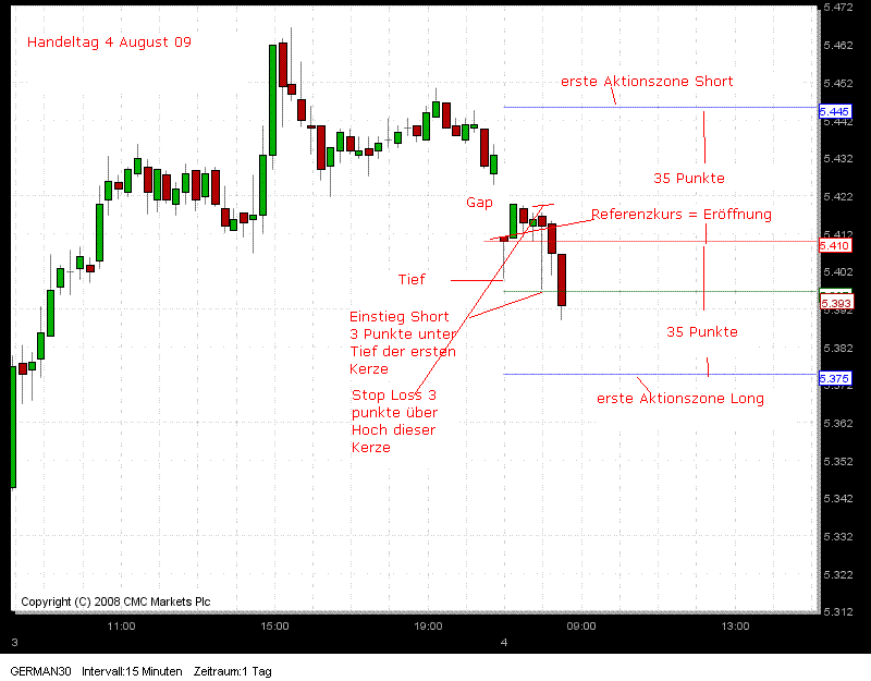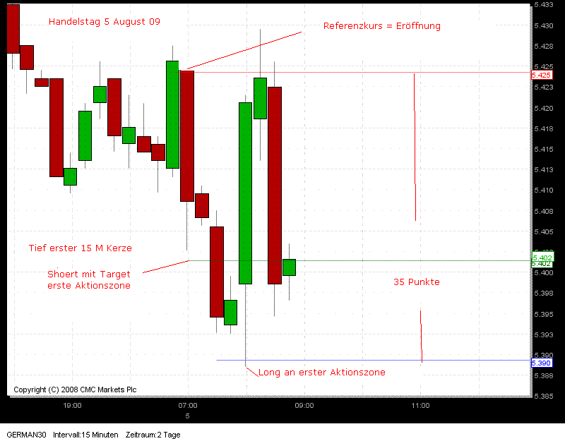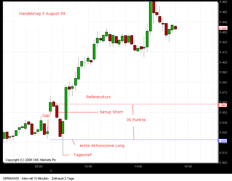 Nach dem neuen ,wenn auch kleinem Jahreshoch am Freitag , ist bis zur Eröffnung der US Börse mit sehr geringer Vola zu rechnen . Aber auch dort stehen heute keine Veröffentlichungen von Wirtschaftsnachrichten an. Der FDAX eröffnete mit einer - Gap von 11 Punkten , jedoch 28 Punkte unter dem XETRA DAX Close. Wie schon letzte Woche erfolgte heute der Ersteinstieg unter dem Eröffnungskurs. Zunächst erfolgte , wie mit Beitrag 561 ausführlich beschrieben , ein Einstieg Long mit reduzierter Stückzahl in Richtung Gap Schließung.Dieser Versuch wurde gemäß der 3 Kerzen Regel mit einem Zeitstopp mit breakeven beendet. Die 3 Kerzen Regel besagt , daß , wenn ein Einstieg außerhalb der Aktionszone mit dem Ziel der Gapschließung erfolgt und das Ziel nach drei 15 Minuten Kerzen nicht erreicht wird ein Zeitstopp die Position auch mit eventuellem Verlust glatt stellt. Im weiteren Verlauf sackte der Kurs bis fast an die erste Einstiegszone Long ab . Zu diesem Zeitpunkt notierte der XETRA Dax mit 60 Punkten im Minus, die DOW Futures jedoch nur mit 15 Punkten. Eine reduzierte Long Position konnte riskiert werden auch wenn man zuweilen dem Kurs etwas hinterher läuft. Einstieg erfolgt dann in einem kleineren Zeitfenster und zwar mit erster 2 Minuten Umkehrkerze. Siehe Chart. Analog zum Micro Trading werden kleinere Gewinnmitnahmen angestrebt. Neulinge der Strategie und Risiko averse Trader verzichten auf diesen Einstieg.