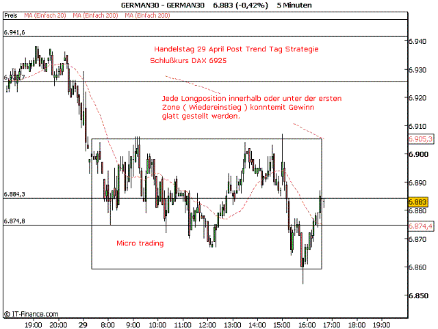 Dienstag 29 April Post Trendtag Strategie mit Einstieg Long Position 40-50 Punkte unter Close DAX Vortag 6925. Erklärungen im eingefügten Chart. Tagesrange DAX nur 46 Punkte,daher für DAX Pivot Strategie kein Einstieg ab 17:35h.