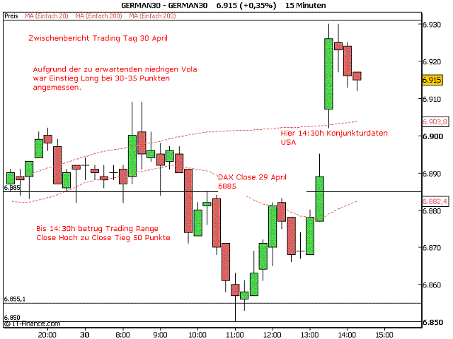 Montag 28 April Gap Play mit Einstieg Short Position 30-35 Punkten über Eröffnung German 30. Erklärung im eingefügten Chart. Aufgrund sehr geringer Vola kein Einstieg für DAX Pivot Strategie ab 17:35h.