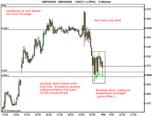 Mittwoch 30 April: DAX Pivot Strategie . Einstieg Long bei 45/50 Punkten unter DAX Pivot Linie 6948.