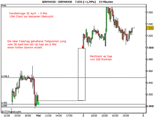 wurden per Mail informiert. Die US Börse legte am 1 Mai erheblich zu und German 30 eröffnete am Freitag den 2 Mai mit einer Up Gap von 100 Punkten. Erklärungen in eingefügten Charts.