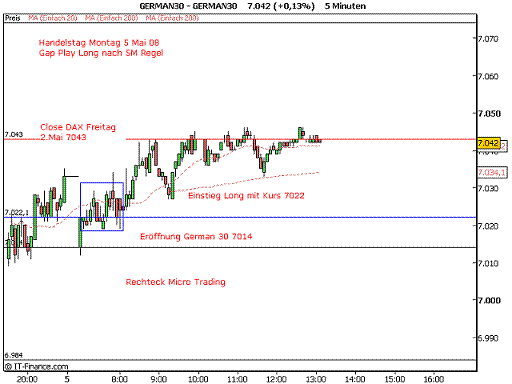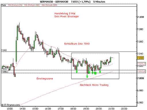 Der eingefügte Chart zeigt einen Einstieg mit Kurs 7022. Micro Trading mit 3 Wiedereinstiegen und Schließung der Gap 7043 gegen10 h erwirtschaften einen angemessenen Gewinn.