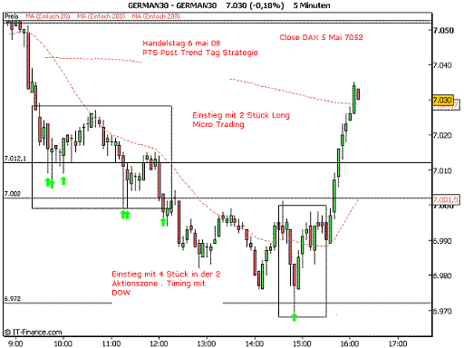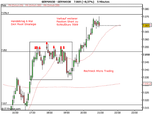 Im eingefügten Chart ist zu ersehen, dass mit Einstieg 2 Stück German Short in der ersten Verkaufzone 7052 und Glattstellung zum Schlußkurs 7069 , ein Verlust von 36 Punkten incl Spread entstanden wäre. Micro Trading mit 7 Wiedereinstiegsmöglichkeiten hat jedoch insgesamt ein Gewinn erbracht.