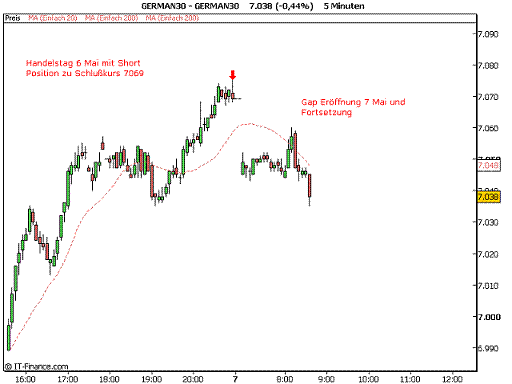 mit Einstieg Short / Long 40 - 50 Punkte über / unter DAX Close von gestern 7052.