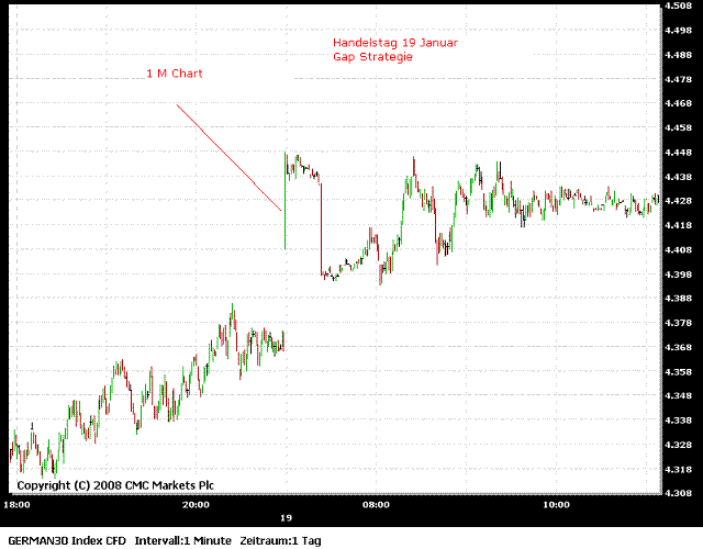 Danke deal2win für deine Gedanken. Hier ist noch Arbeit zu leisten. Wenn der Xetra DAX um 9h startet so ist der Eröffnungskurs , insbesondere bei Gaps, verzerrt, denn viele Aktien werden mit einer Zeitlücke notiert. So ist auch der Eröffnungskurs bei dem FDAX um 8h oft nicht handelbar und damit auch nicht bei cmc. Eingefügt der 1Minuten Chart von heute morgen . Der Eröffnungkurs wird mit 4412 und das Hoch mit 4448 notiert.Über das 2 Klicks System kann man den handelbaren Kurs auch feststellen oder mit einem kostenlosen Anruf in London Bestätigung erhalten. Wie dem auch sei ,als Eröffnungskurs nahm ich 4440 und teilte diesen auf Anfrage auch einem Marktteilnehmer mit.Aufgrund der Kurslücke konnte man entweder in der ersten Zone Short einsteigen oder die 5M Regel anwenden. Die erste Aktionszone wurde nicht angesteuert und sofern man sich nicht direkt für die 5M Regel entschlossen hatte ,gab es dazu später noch 2Mal Gelegenheit. Was das von dir erwähnte Retracement anbetrifft ,so gilt dies nur für late Breakouts .Siehe Beitrag von gestern . Der charttechnische Stopp von 50 Punkten entspricht keiner Strategie .Bitte dich daher mich bei ähnlichen Gedanken per Mail zu kontaktieren.