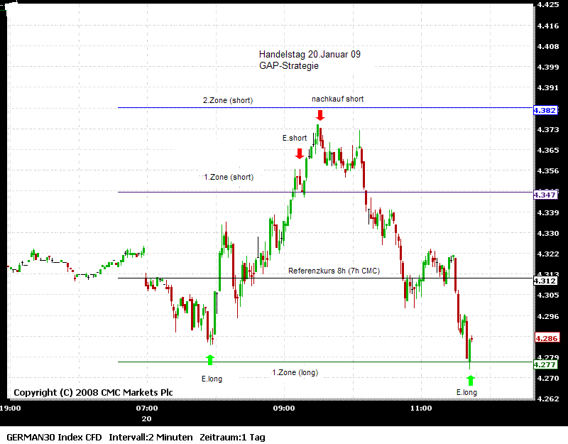 Diese sind ,wie es die Bezeichnung erkennen läßt , Zonen um eine etablierte Linie .Einstiege können daher vor oder hinter den Linien in einem nahen Abstand ausgeführt werden und zwar in Abstimmungmit dem 15M Chart DOW. Es kann also durchaus vorkommen ,dass man dem Kurs " hinterher " läuft. Der heutige Eröffnungskurs German 30 wurde mit einer - Gap von 12 Punkten mit 4312 taxiert. Demgemäß wird der Einstieg Short an der Zweiten Aktionszone empfohlen. Siehe Charts von heute morgen. -