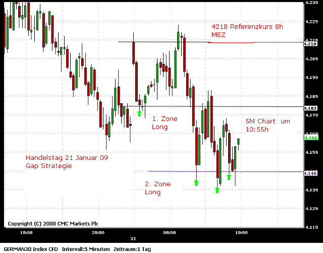 Hallo Phantom, seit längerer Zeit verfolge ich aufmerksam deine Postings. Ich handle bei ABN und da gibts den Future nicht. Ich habe trotzdem mal die Aktivzonen in den Dax eingezeichnet u. die Referenzlinie um 8.00 Uhr bzw. 17.30 Uhr. Da der Dax ja parallel zum Future läuft ( oder ? ) muß es ja eigentlich ähnlich funktionieren. Und obwohl ich keine Gapvorgaben habe, konnte ich durch Einstiege an den Aktivzonen bis jetzt gute Ergebnisse erzielen. (Papertrading) Achte aber konsequent auf Umkehrkerzen im Dow. Habe mal ein Bsp. von heute. ( kann mich auch nur Freedriver anschließen, eigentlich ein einfacher Tag heute )