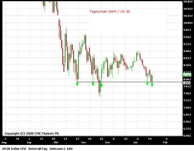 Nach dem Chartbild konnte man den heutigen Late Breakout schon gestern erwarten und mein entsprechender Hinweis- unter anderem an Peganuss - war verfrüht. Wie so oft nach einem wichtigen Ereignis in den USA reagiert die Börse einen Tag zeitverzögert. Eingefügt der DOW Tageschart. Es ist zu erkennen, dass der Kurs 7960 fünf mal als Unterstützung diente. Derartig wichtige charttechnische Muster sind insbesondere für die Pivot Strategie zu berücksichtigen. Late Breakouts finden nach 20 h statt und zwar dann ,wenn die US Big Boys vom Mittagessen zurückkehren. Wer also um 20h MEZ seine kleine Gewinnposition nicht glatt gestellt hat gehört zu den vorläufigen Verlierer. -