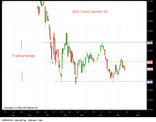 Aus meiner Sicht gehören Wahrscheinlichkeiten der Kursdynamik zum Trend ,die sich ja in jedem Zeitfenster ständig manifestieren. Eingefügt Tageschart German 30 mit einer Berichtszeit seit Oktober 2008. Ein perfekter Seitwärtstrend ( ist auch ein Trend ) mit einer Handelsspanne von durchschnittlich 1000 Punkten. Einstiege Short über und Long unter dem Mittelwert 4600 hätten sich gelohnt. Ein ähnliches Chartbild ist immer wieder zu beobachten . Siehe Mai - Dez. 2007 und Januar - Juni 2008. Trends innerhalb eines Trends sind insbesondere für Swing Trader interessant.