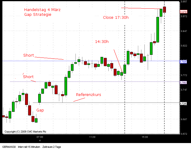 "Gap und Pivot Strategie bilden , zusammen mit der Intermarket Abhängigkeit von der US Börse , eine Einheit die von Part-Time-Trader kaum zu erfassen ist. Es handelt sich um einen Endloskontrakt der, je nach Strategie , morgens oder abends durchaus ein Verlust zu läßt jedoch in der Regel mit der nächsten wieder ausgeglichen wird."