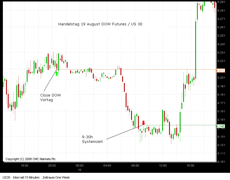 für 7 Tage Live Unterricht erteilen könne. Als Rekompensation würde er mich dann für 6 Monate mit 25% Prozent an seinem Gewinn beteiligen. Er fügte hinzu , dass er über ein großes Konto verfüge. Habe zwar geschmunzelt aber die Angelegenheit bitter ernst genommen und höflich geantwortet, dass ich kein Geld benötige und er 1.den Thread in Gänze studieren ,2 .dann 1 Monat demotraden und 3 . danach 3 Monate mit Kleinsteinsatz real üben solle. Würde danach erkennbar sein , dass er sich für Day Trading eigne ,wäre ich gerne bereit ihn 1 Woche kostenlos full time zu unterrichten . Allerding im George V in Paris für die er dann die Kosten übernehmen müsse ,denn schließlich hat er ja ein großer Bankkonto.Damit irgendeinem Nachtrader keine ernshaften finanziellen Verluste entstehen, habe ich bewußt die stringente Regel mit den DOW Futures eingebaut die sich in der Praxis bisher bestens bewährte . Neben Regeln gibt es für erfahrerene Trader eine diskretionäre Entscheidungsfindung die auf der Charttechnik und der- im -Moment Einschätzung des Börsenumfelds beruht die auch schon mal risikofreudiger sein darf. Betrachten wir die 2 eingefügten Charts German und US 30. Zunächst war gestern bei Eröffnung festzustellen ,dass im Verhältnis zum Close XETRA DAX ein Doppelgap vorlag , wenn auch kein großes. In diesem Forum wurde wiederholt informiert , dass abgesehen von der hohen Wahrscheinlichkeit der Gapschließung , diese Doppel Gaps zumindest das Gap zum XETRA DAX + schließen .Orientiere mich zwar immer an den DOW Futures Notierungen bei CNBC aber auch im Chart US 30 von cmc ist beim Ersteinstieg Long um 9:15h Systemzeit keine DOW Futures Notierung von -80 auszumachen und um 9:30 schon gar nicht -120. Im 15 Minuten German 30 Chart ( siehe Rechteck ) erkennen wir einen perfekten Pivot mit unterem langen Docht. An der zweiten Umkehrkerze erfolgte dann um 9:30 h der Einstieg Long. Habe auch Dir beste Unterlagen über die Charttechnik von Capra zur Verfügung gestellt . Bitte immer wieder konsultieren . Hast Du wenigstens heute den Einstieg Short geschafft ? Erwarte dazu keine weitere Antwort in diesem Thread die ich nochmal beantworten müßte, denn für ein Senior ist die Zeit ein wertvolles Gut ! Ruf mich einfach an.