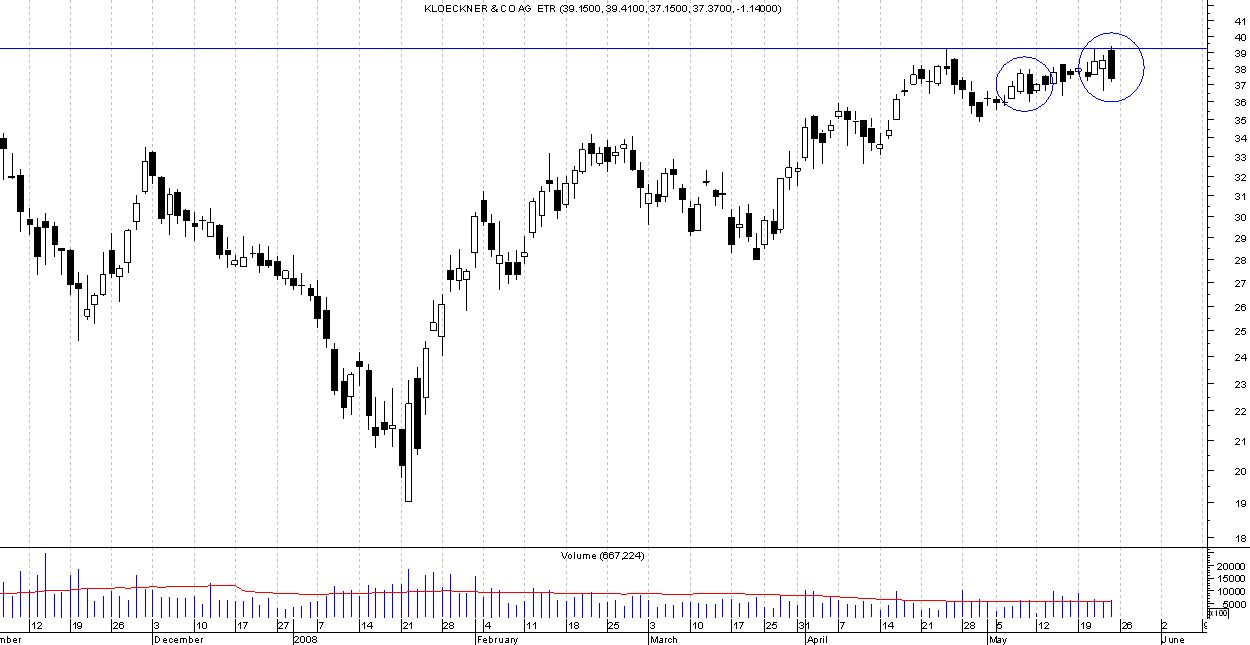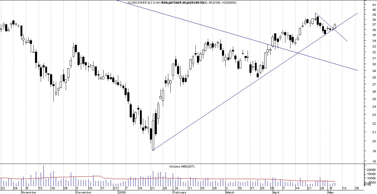 Hier longchance da im Aufwärtstrend ne Konsolidierung nun mit der längeren weissen Kersze beendet scheint. Leider fehlt hier etwas das Volumen, aber da mir Klöckner bereist früher gute Dienste erwiesen hat Versuch ich hier nochmal mein Glück. Einstieg heute (Donnerstag) zum open.