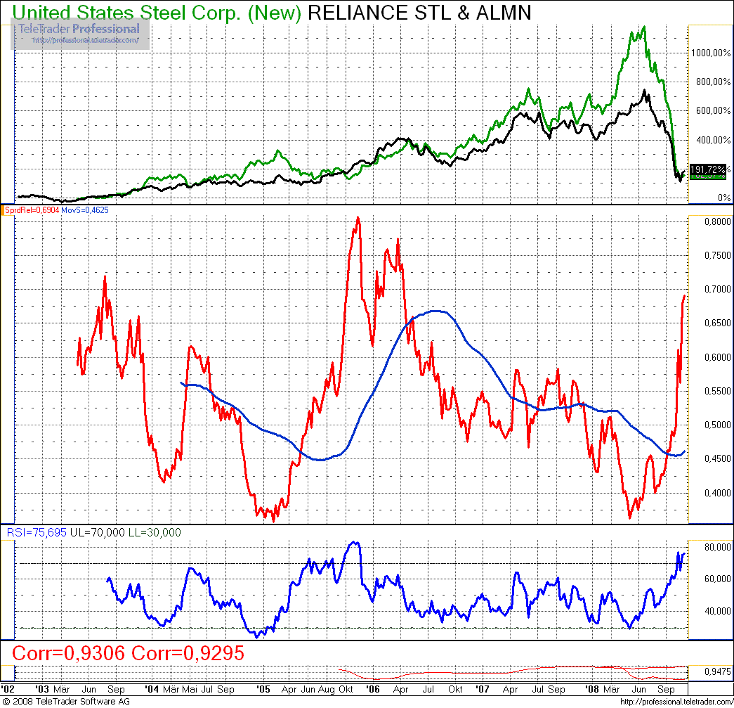 Diesesmal aus dem Bereich "Basic Materials": United States Steel ("X") hat seit Mitte des Jahres um einiges mehr an Wert verloren als Reliance Steel ("RS"). Es gibt zwar noch einen Spielraum zum All-Time Hoch im Spread der beiden, aber ich bin der Meinung das es derzeit eine interessante Einstiegschance ist.