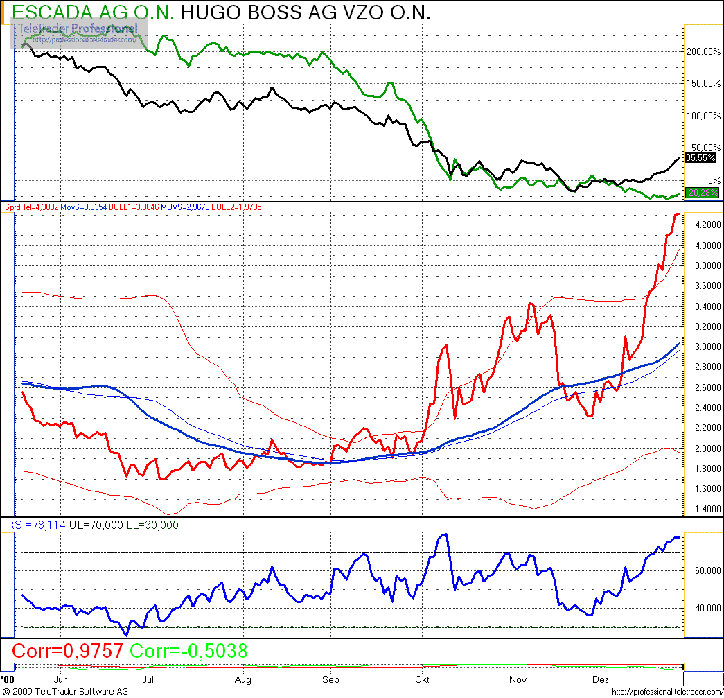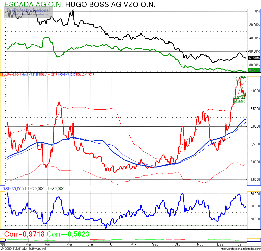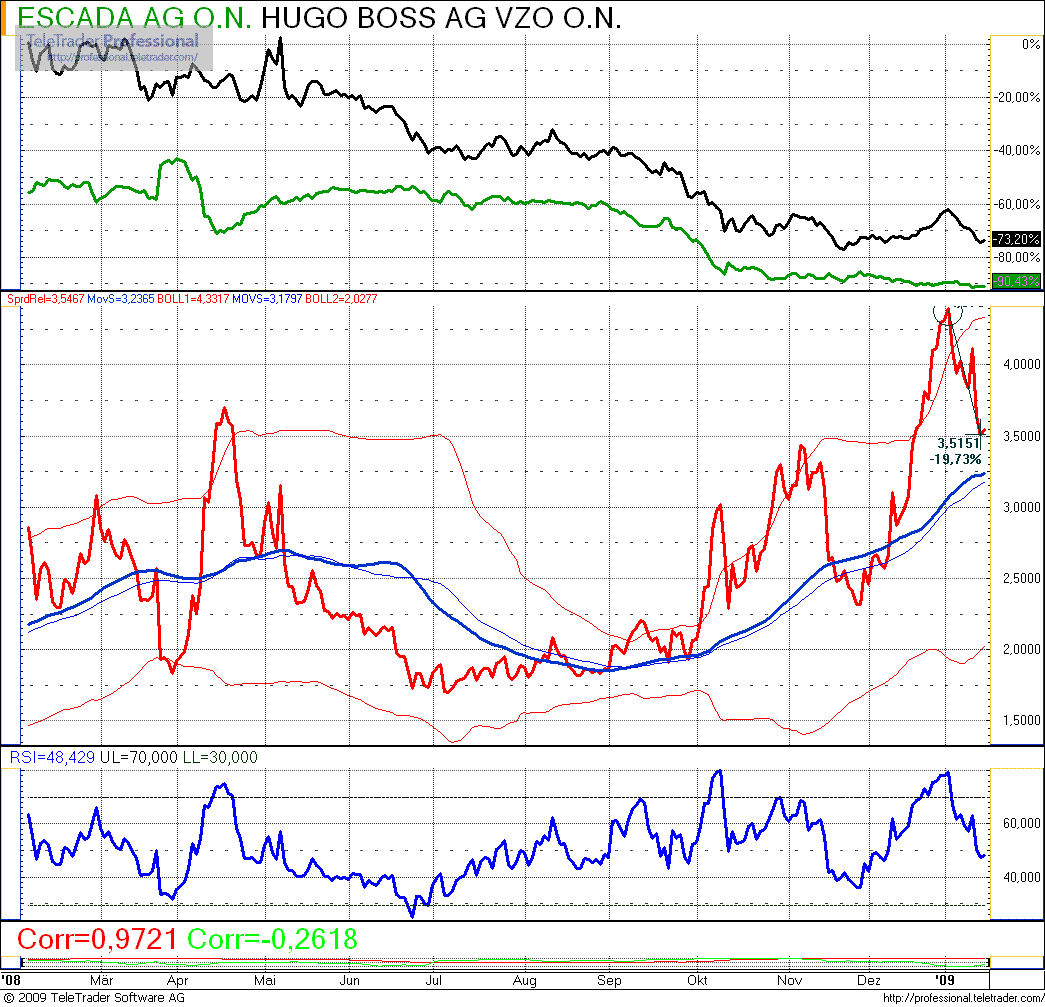 Das bei Escada und Hugo Boss eine Divergenz der Korrelation vorliegt ist charttechnisch betrachtet offensichtlich.
