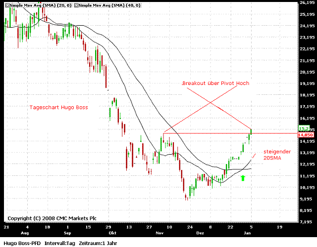 Escada ist von 37 EUR auf 3,20 abgestürzt und zum Penny Stock mutiert. Diese Aktie wird unter dem 20 SMA gehandelt . Der Aktie Hugo Boss ist heute , mit Kurs 15,20 und über dem 20 SMA ,der Ausbruch über das letzte Pivot Hoch geglückt. Bei diesem Price Ratio oder der Relativ Performance kann man auch mit gesundem Optimismus nicht erkennen warum eine alsbaldige Rückkehr zum Mean ( Mittelwert ) erfolgen und somit ein Ergebnis von 15 -20% erwirtschaftet werden kann.