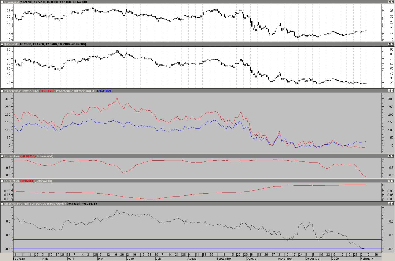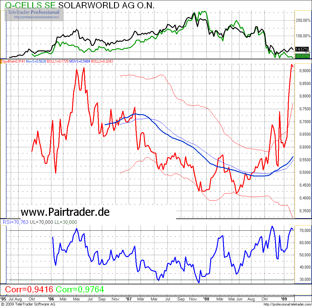 Da Pairtrader seine eigene Strategie in einem Blog weiterführt, hoffe ich, den Thread nicht zu stören, wenn ich hier ein Paar vorstelle, das sich imho ebenfalls für eine Pair-Strategie anbietet. QCells und Solarworld. Gleich Branche, zumindest ähnliche Marktkapitalisierung und eine hohe 250-Tage-Korrelation (0,96), ein Spread, der sich in den letzten Wochen ausgeweitet hat und nach meinem Relative Strength Indikator in Metastock, der die prozentuale Veränderung der Werte vergleicht, ein Extrem erreicht hat. Demnach sollte man QCell long und Solarworld short gehen.