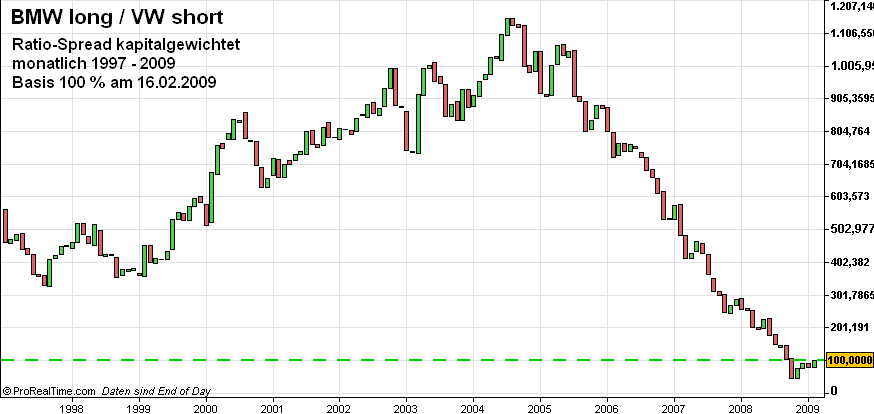 Der Spread der beiden schwankt schon viele Monate in einer weiten Range. Derzeit befindet er sich am oberen Ende der Skala, somit könnte dieser Trade eingegangen werden. Ein Rebound scheint wahrscheinlich. Potentzial ca. 20% (bei Mittelwert).
