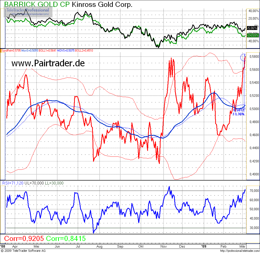 Kinross (KGC) hat in den letzten Tagen Barrick Gold (ABX) abgehängt. Mittelfristig bewegen sich beide Unternehmen sehr ähnlich, sodass ein Pairtrade eingegangen werden kann. Zusätzlich ist der RSI-Indikator (für den Spread) in einer übergekauften Zon.