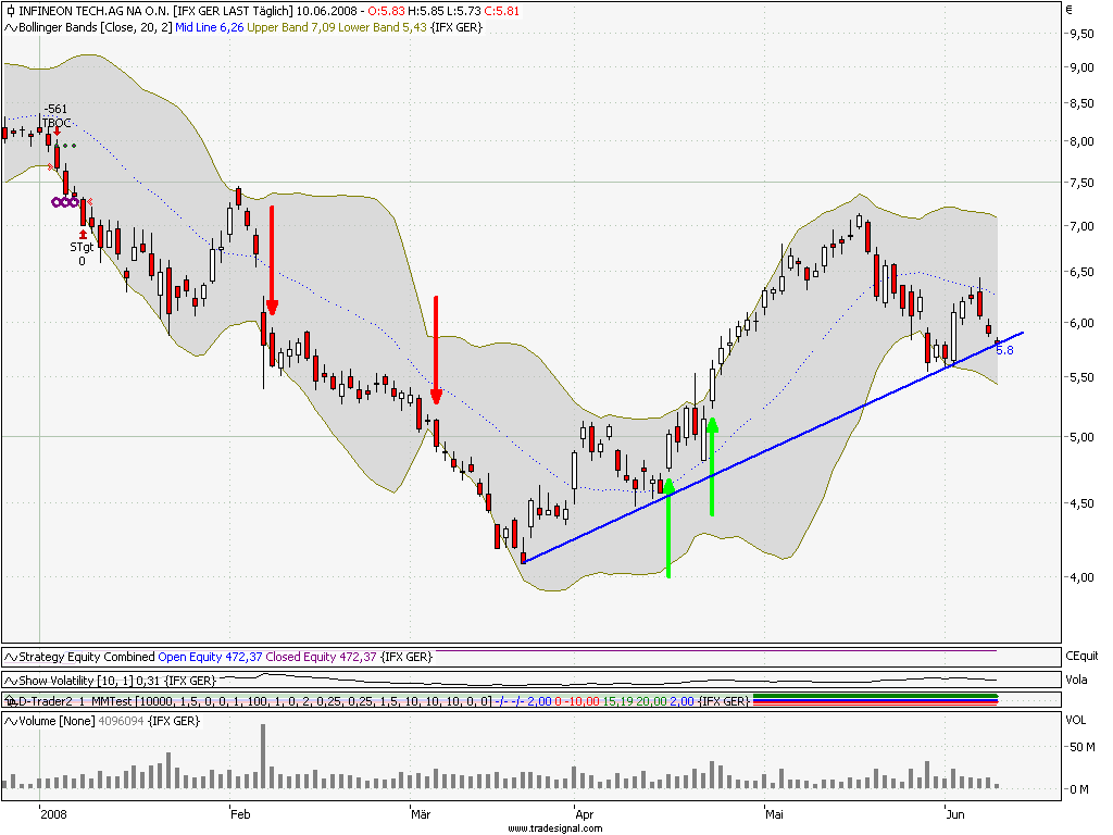 Seit Mitte des letzten Jahres eigentlich nur im Rückwärtsgang, konnte sich Infineon erst im April wieder fangen und über 70% in wenigen Wochen zurücklegen. Nach einer Korrektur zurück an den Aufwärtstrend hat die Aktie am Freitag nun ein bedenkliches Pattern ausgebildet. Der Abprall am mittleren Bollinger Band wäre für aggressive Shorties schon Einstiegsmöglichkeit genug. Die aktuelle Woche startete denn auch mit Verlusten, heute erneut ein bearisches Gap gen Süden. Schließen wir nun noch unter 5,75€ und im Laufe dessen unter 5,6€, wird der übergeordnete Abwärtstrend erneut seine Freude haben.