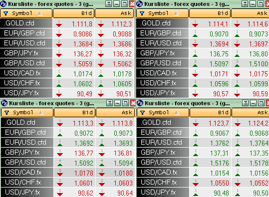 Ich mach dir mal in unregelmäßigen Abständen Screenshots von einer FX-Kursliste.Der Autor ist in den besprochenen Werten zumeist selbst investiert. Traden auf eigene Gefahr, Signale sind aktuell großteils experimentell zwecks Challenge "In 30 Tagen zur Trading Strategie".