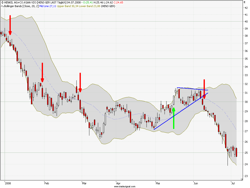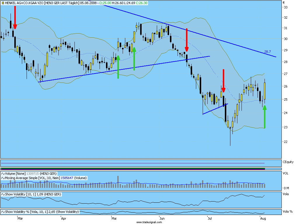 Sehr schöner bullischer Abpraller heute vom mittleren Bollinger Band, nach dem die Gegenreaktion seit dem Tief am 15. Juli schon zu 22% Zugewinn geführt hat. Da wird wohl ernsthaft der Abwärtstrend um 28,7€ attackiert werden, daher schließe ich mich dieser Hoffnung mit einem Longtrade an.